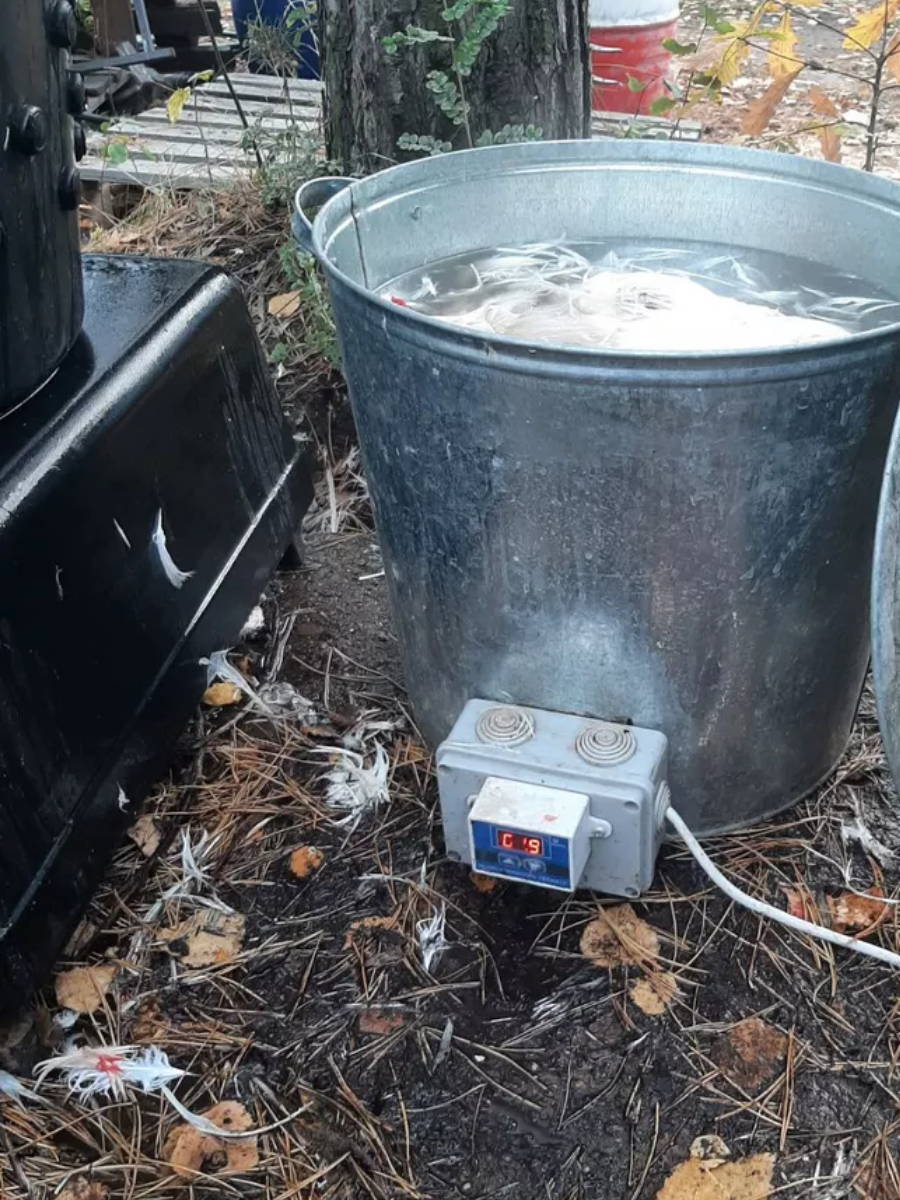 Правильная тепловая обработка тушки перед ощипыванием позволяет деликатно без повреждений снять всё перо с тушки. Можно попробовать обойтись подручными средствами, например, кастрюлей с горячей водой, но отклонение от нужной температуры даже на 3-5ºС может привести к тому, что либо перо будет удаляться не полностью либо кожа тушки будет рваться и менять цвет.
