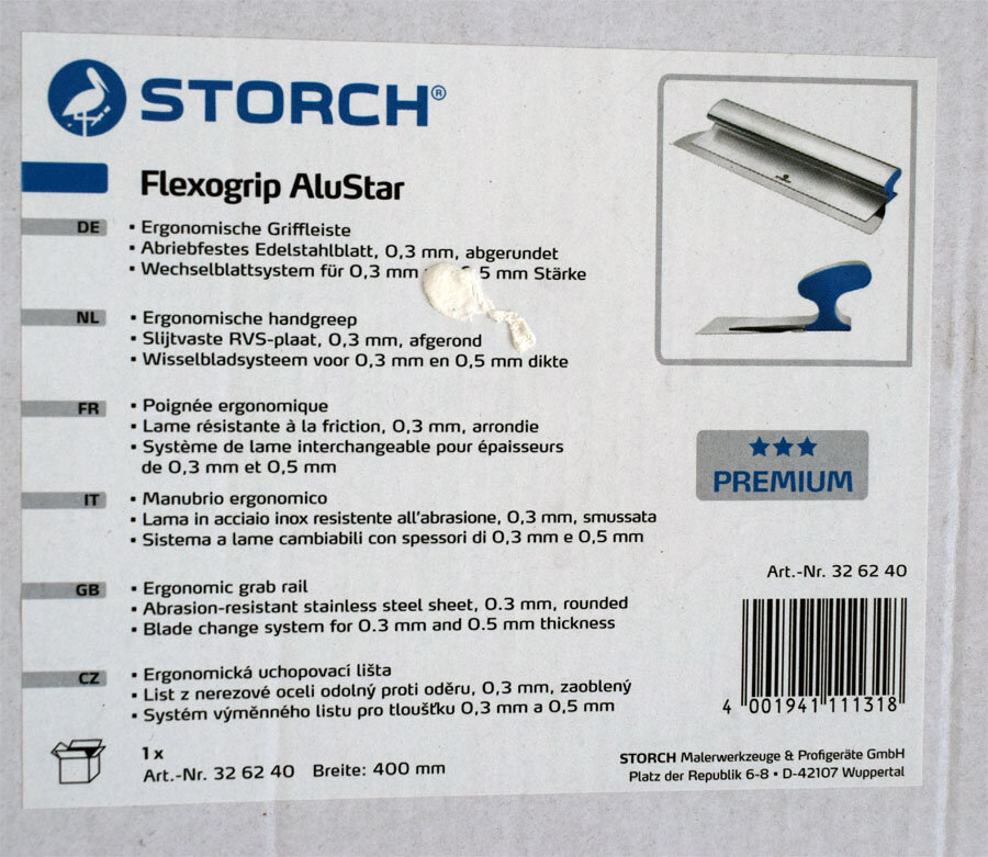 Это действительно профессиональный шпатель с эргономичной рукояткой производство Германия. Качественный инструмент выполненный из высококачественного анодированного алюминия, очень прочный и легкий - это новинка 2016 года от Storch. Рабочая поверхность лезвия шириной 40 см выполнена из высоколегированной нержавеющей стали.