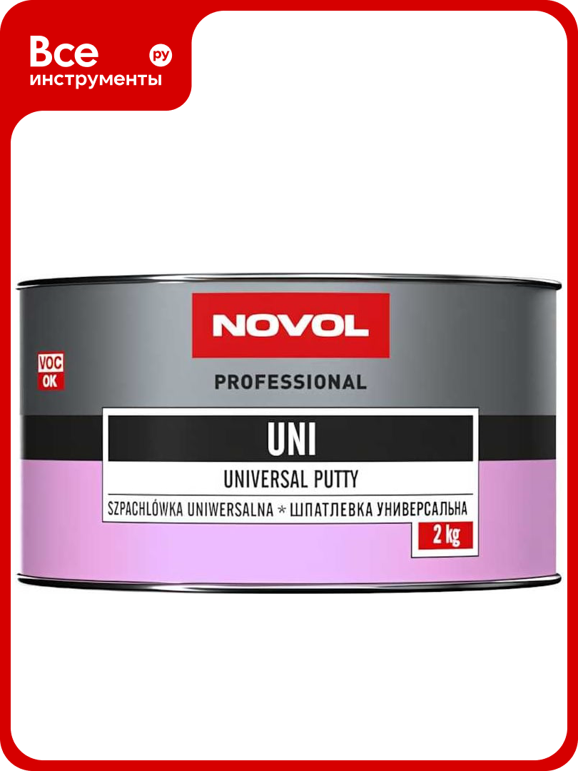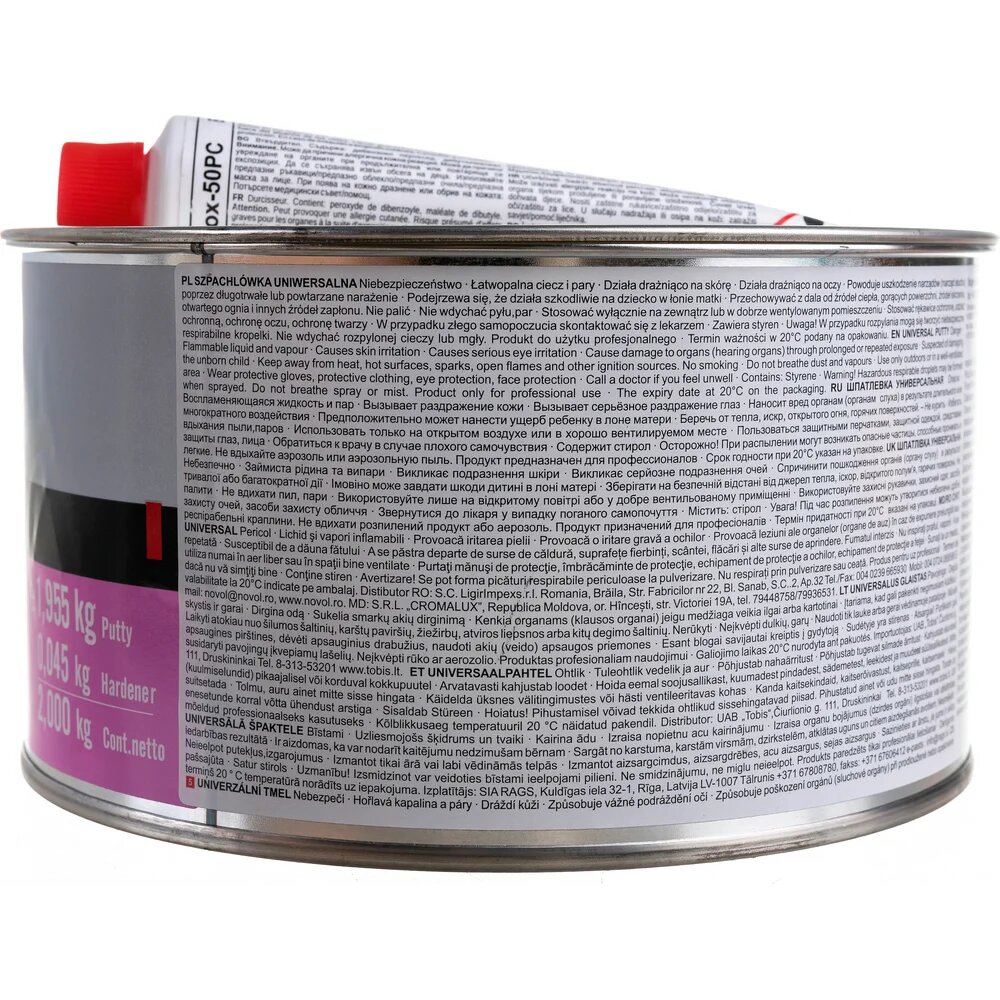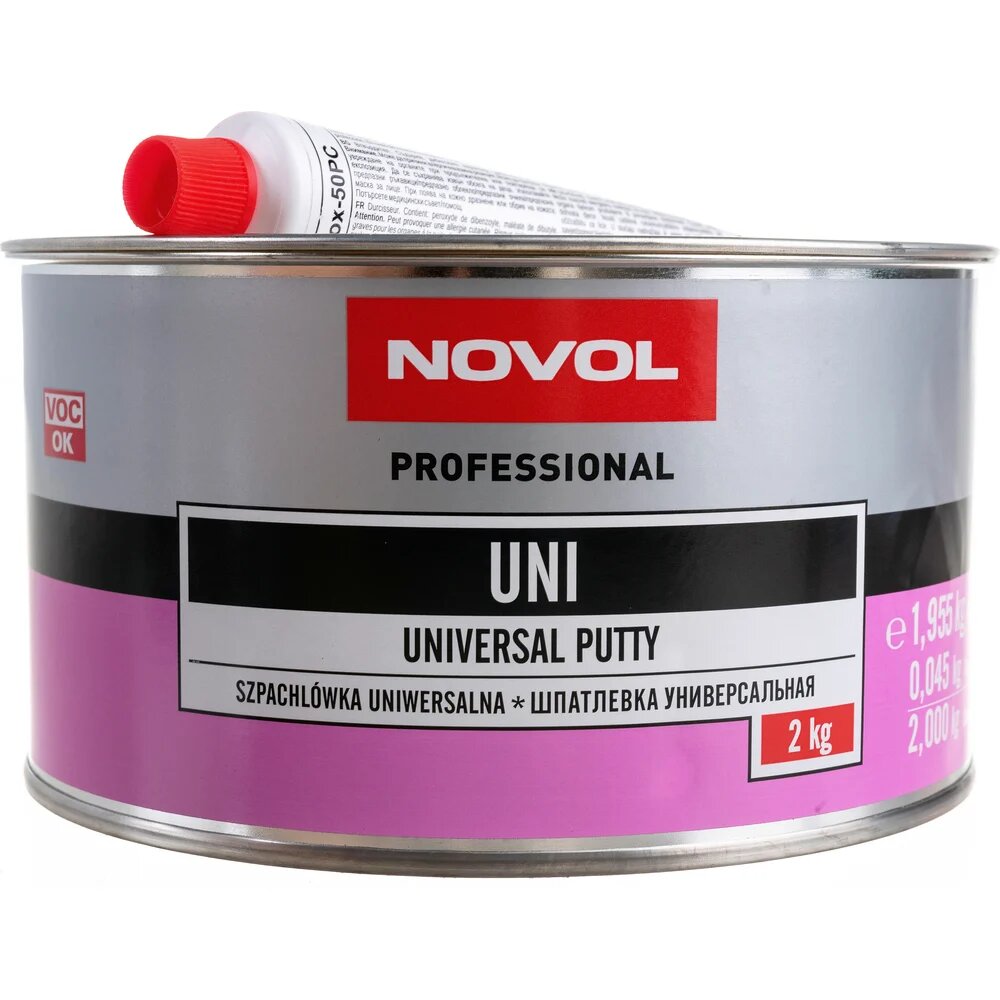Универсальная полиэфирная заполняющая автомобильная шпатлевка Novol Uni Universal Putty, относительно прочная и с небольшой эластичностью, рекомендуемая в основном для механической обработки, а также для применения на небольших поверхностях или для небольших ремонтов. Хорошо наносится тонкими слоями шпателем и заполняет мелкие неровности и царапины. Материал обладает прекрасной адгезией к разным видам оснований, в том числе к стали, алюминию, полиэфирным ламинатам, акриловым грунтам и старому ЛКП, также широко применяется при малярных и отделочных работах по дереву, бетону и пластмассе. Не наносить непосредственно на реактивные грунты. Воздушная сушка при 20 °С. около 20-30 минут, температурная сушка при 60 °С. около 10 минут. Пропорция смешивания с отвердителем 2-3%. Смешивать с отвердителем малыми частями непосредственно перед нанесением, время жизни готовой смеси (при смешивании с отвердителем) около 4-6 минут при 20°С. Минимальная температура нанесения +10 °С. Шпатлевка поставляется в комплекте с отвердителем. Шпатлевка Novol Uni - незаменимый высококачественный продукт для быстрого профессионального автомобильного ремонта, а также при бытовом ремонте вещей.