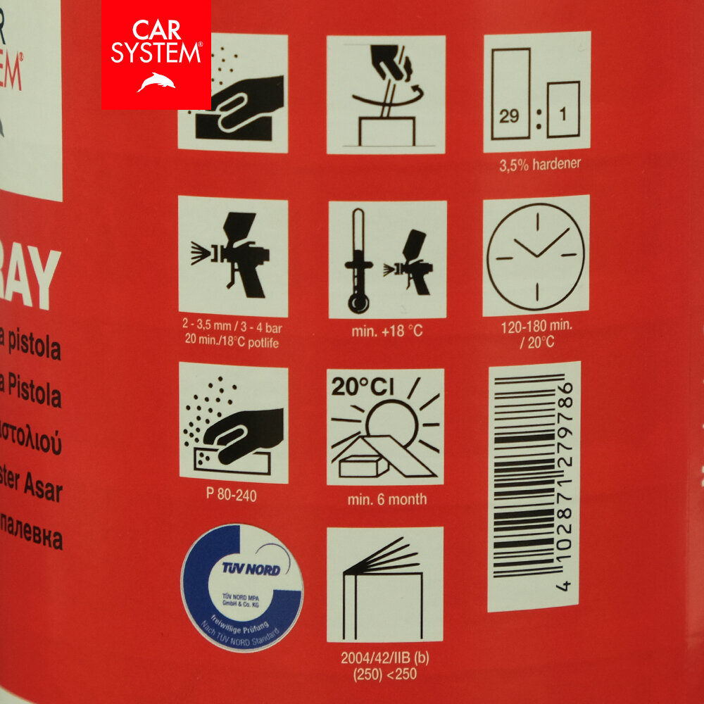 Жидкая шпатлевка Carsystem 2K Spray – легко обрабатываемая напыляемая полиэфирная шпатлёвка с отличной адгезией к металлу или другим полиэфирным шпатлёвкам. Все поверхности должны быть отшлифованы перед нанесением шпатлёвки Spray. Шпатлёвка обладает сбалансированной тиксотропностью и наполняющими свойствами, благодаря чему великолепно заполняет поры и риски от шлифования. После застывания шпатлёвка образует слегка текстурированную поверхность, легко контролируемую визуально при шлифовке.