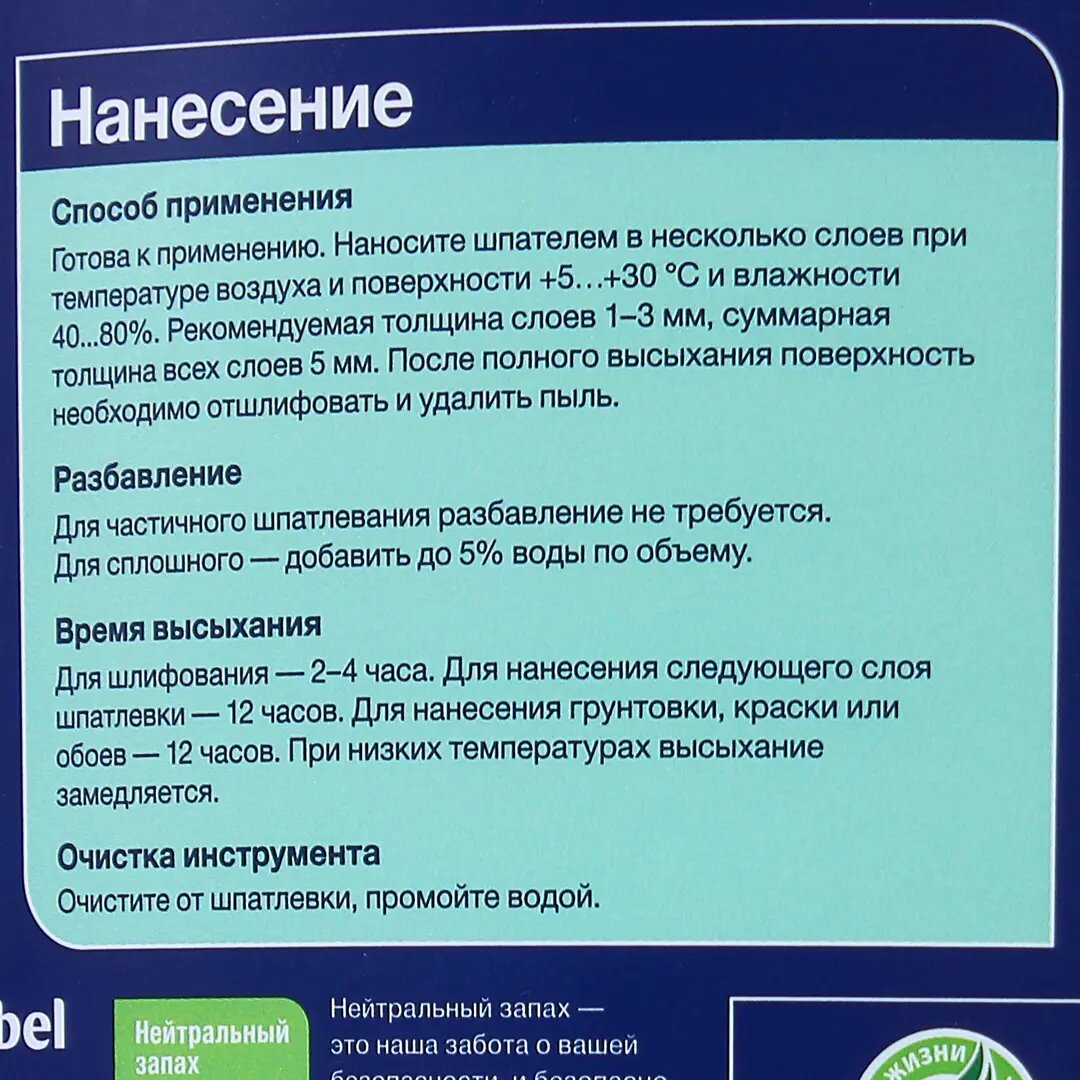 Финишная шпатлевка полимерная Dulux — белое финишное покрытие с гладкой матовой фактурой. Используется для отделки стен и потолка в сухих помещениях, покрытия небольших участков. Область применения Смесь предназначена для любых видов работ: заделки, ремонта, строительства. Универсальная шпатлевка устраняет неровности и шероховатости, заполняет углубления и трещины, маскирует швы. Подготавливает поверхность под оклейку обоями или покраску. Покрытие устойчиво к растрескиванию. Подготовка основания и нанесение шпатлевки - Перед нанесением шпатлевки с поверхности удаляются грязь и жировые следы, ржавчина, шлифуется старое покрытие (краска, шпатлевка). - После выполняется очистка от пыли, оставшейся после шлифовки. Поверхность должна быть чистой и сухой. - Шпатлевка распределяется шпателем, по окончании работ инструмент очищается водой. - Состав схватывается быстро. 1 слой толщиной до 3 мм высыхает в течение 2-4 часов, после чего его можно шлифовать. - Перед нанесением следующего слоя, покраской или оклейкой обоями рекомендуется выждать 12 часов. Характеристики материала - Подходит для нанесения на бетон, штукатурку, кирпич или гипсокартон. - 1 литра шпатлевки достаточно, чтобы покрыть 1 м² поверхности в 1 слой. - Изготовлено в России.