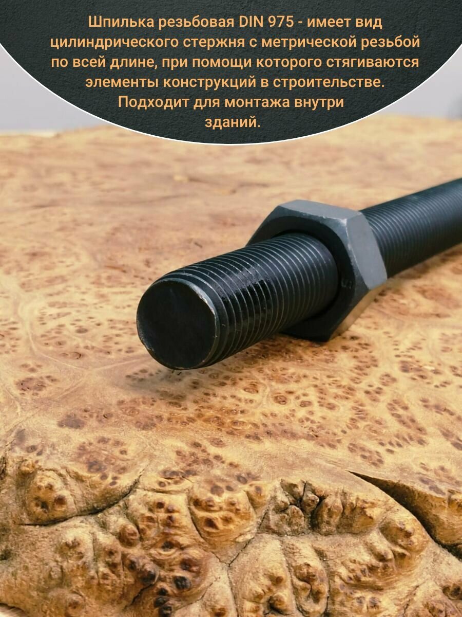 Высокопрочная резьбовая шпилька DIN 975 – метровая стальная штанга с полной метрической резьбой, нарезанной способом холодной накатки. Штанга DIN 975 предназначена для стяжки и соединения деревянных и металлических элементов, а также для удлинения крепежных резьбовых конструкций. Стержень резьбовой класса прочности 12.9 находит применение при установке опалубки, монтаже воздуховодов, для крепления лаг и фиксации подвесного оборудования. Шпилька резьбовая имеет вид цилиндрического стержня с метрической резьбой.