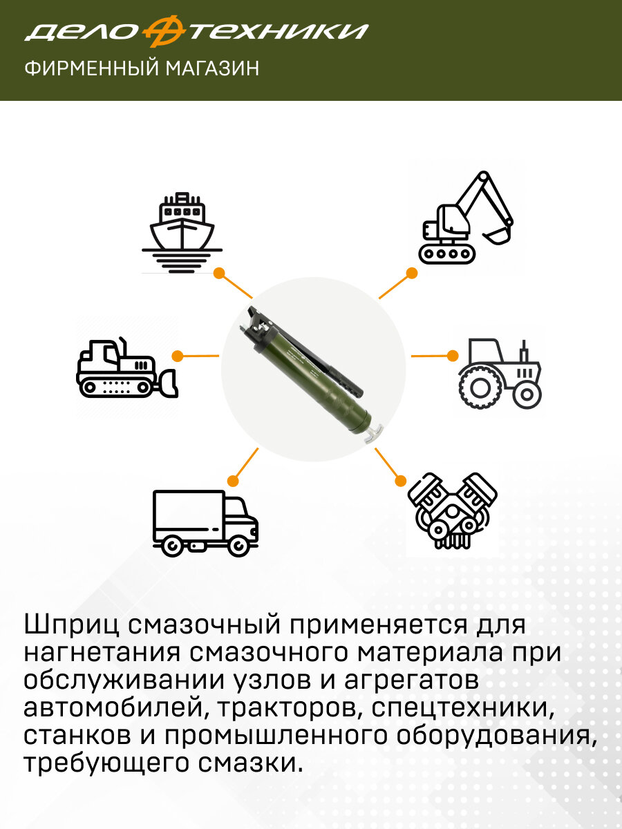 Шприц смазочный применяется для нагнетания смазочного материала при обслуживании узлов и агрегатов автомобилей, тракторов, спецтехники, станков и промышленного оборудования требующего смазки.