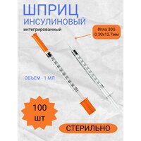 Шприц инсулиновый с интегрированной иглой (30G 0.30x12.7), медицинский, стерильный, 1 мл - 100 шт