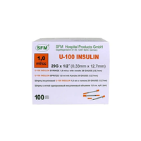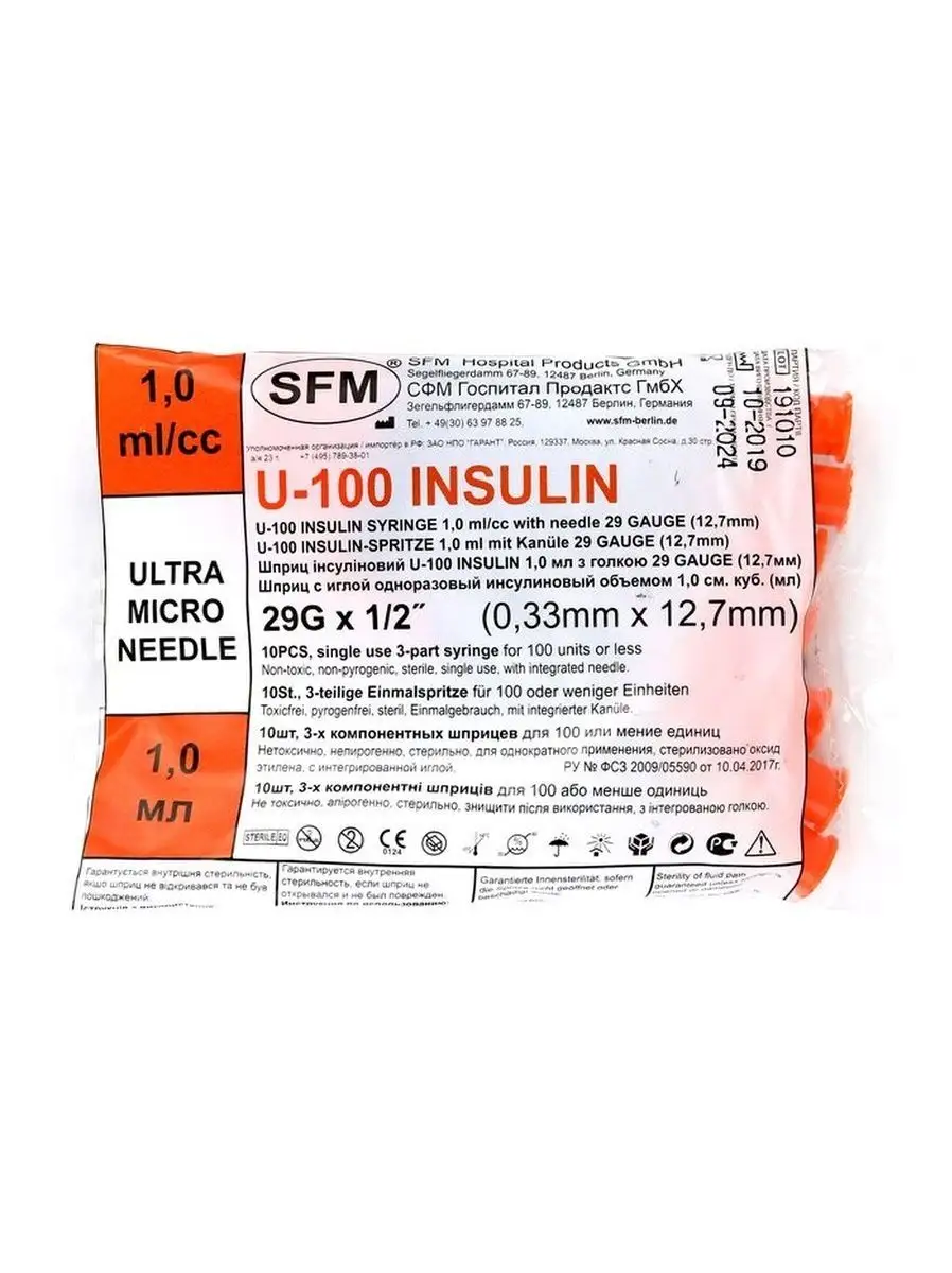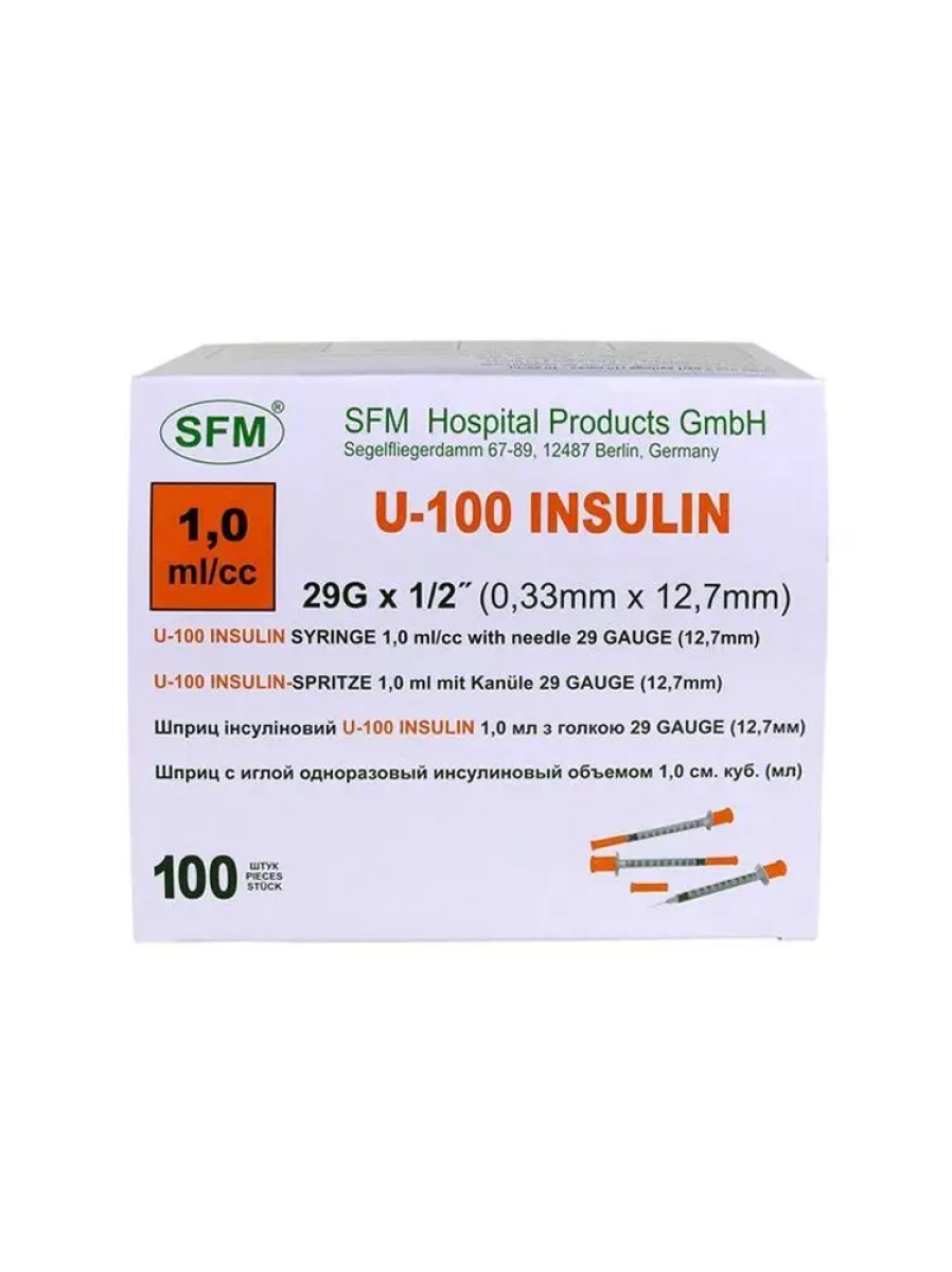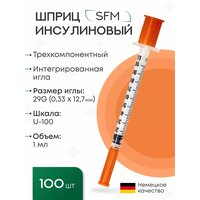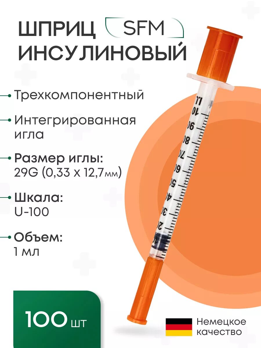 Трехкомпонентный шприц SFM 1 мл, для подкожного вливания инсулина 100 U, индивидуально упакованные в блистер, игла надета на шприц.
