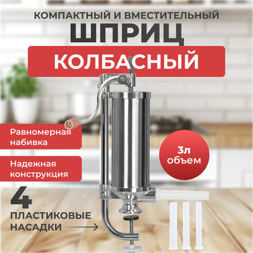 Вертикальный ручной шприц для набивки колбасных изделий рассчитан на 3 кг любого фарша. Подходит для всех видов натуральных и искусственных оболочек. Простота обслуживания и использования делает его идеальным инструментом для домашнего изготовления мясных изделий. Силиконовый диск поршня позволяет эффективно использовать устройство и ускорить процесс набивки колбас. Вертикальная конструкция шприца позволяет занимать мало места на столешнице. В комплекте 4 насадки для оболочек разного калибра. Диаметры насадок: 15, 19, 22, 25 мм. Материал: Нержавеющая сталь. Вместимость шприца - 3 кг фарша.