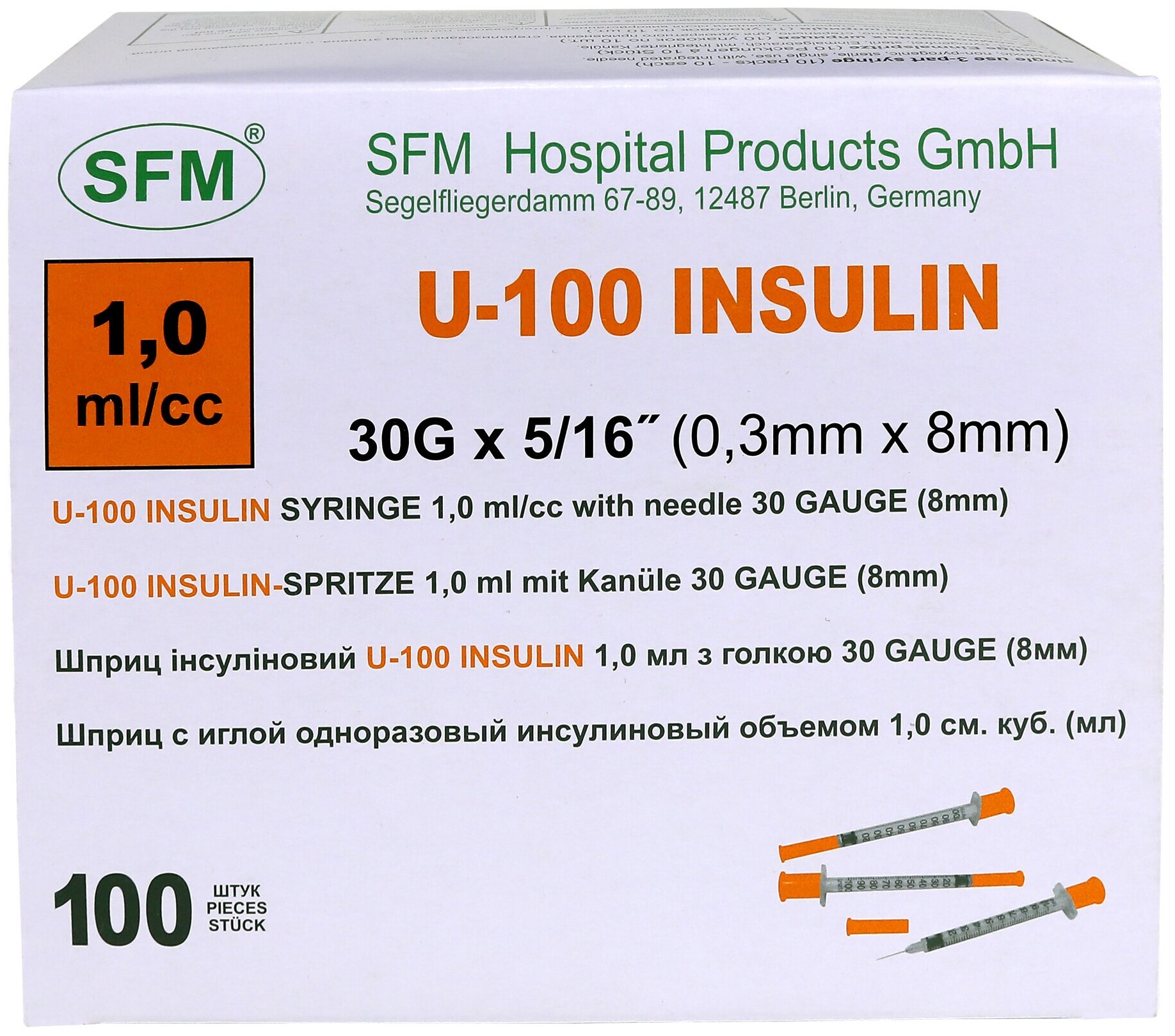 Компонентность: 3 (цилиндр + поршень + манжета); Объём: 1 мл; Материал полипропилен; Стерильность: стерильно; Стерилизация: Оксид этилена; Тип крепления: интегрированная игла, шкала U-100; Игла интегрированная (несъёмная), 30G (0,30 х 8 мм); Оранжевый колпачок; Одна шкала делений (U 100). Упаковка 100шт Производство: SFM Hospital Products GmbH, Германия.