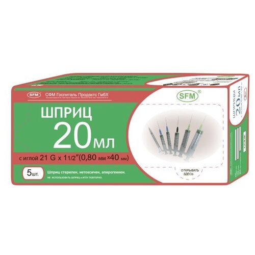 Купить Шприц SFM трехкомпонентный, 40 мм x 0.8 мм, размер: 21G, 20 мл, 5 шт., 5 уп. с доставкой по всей России. Шприц SFM трехкомпонентный, 40 мм x 0.8 мм, размер: 21G, 20 мл, 5 шт., 5 уп.: сравнение цен, характеристики, фото, актуальное наличие и цены.