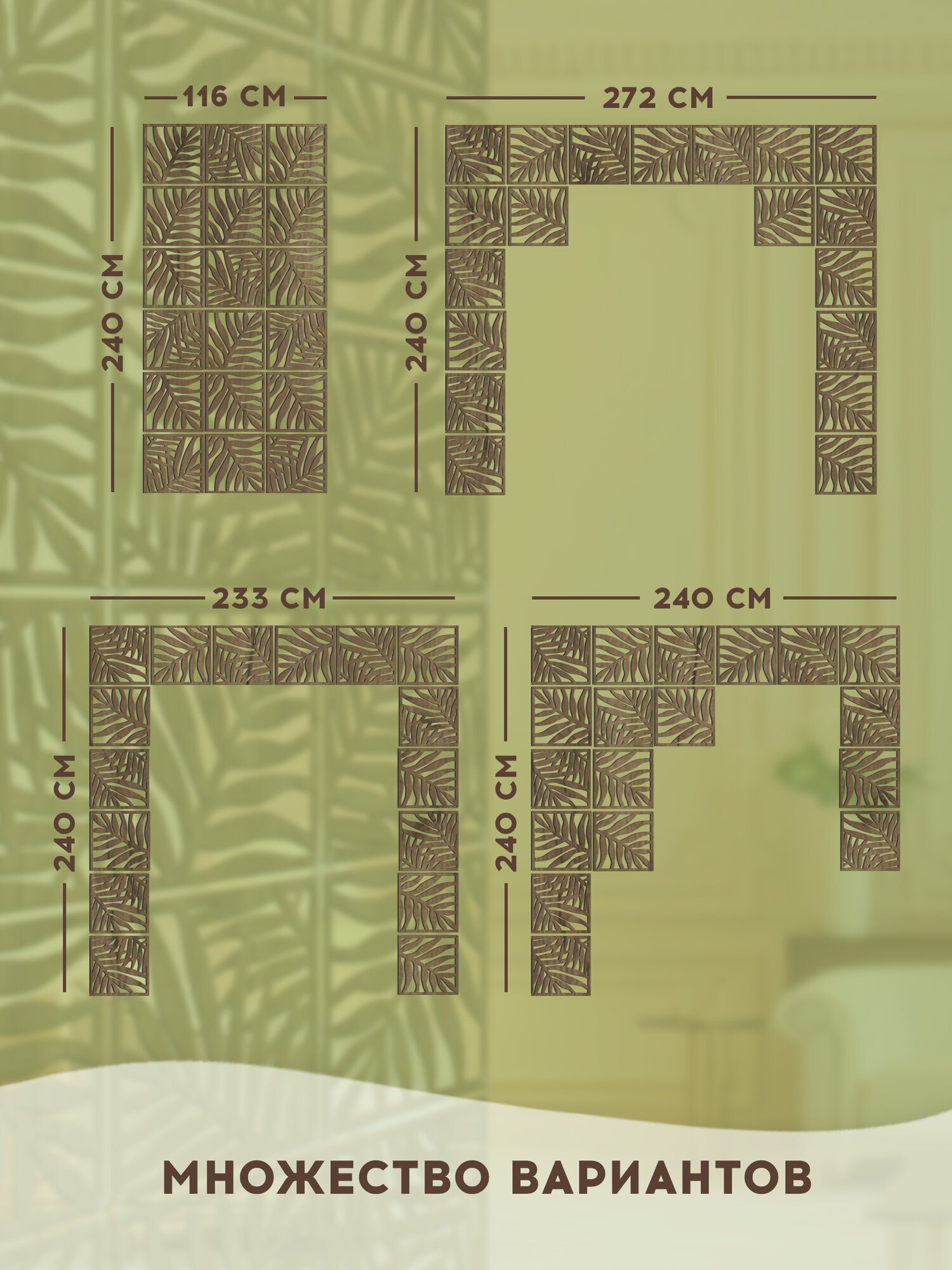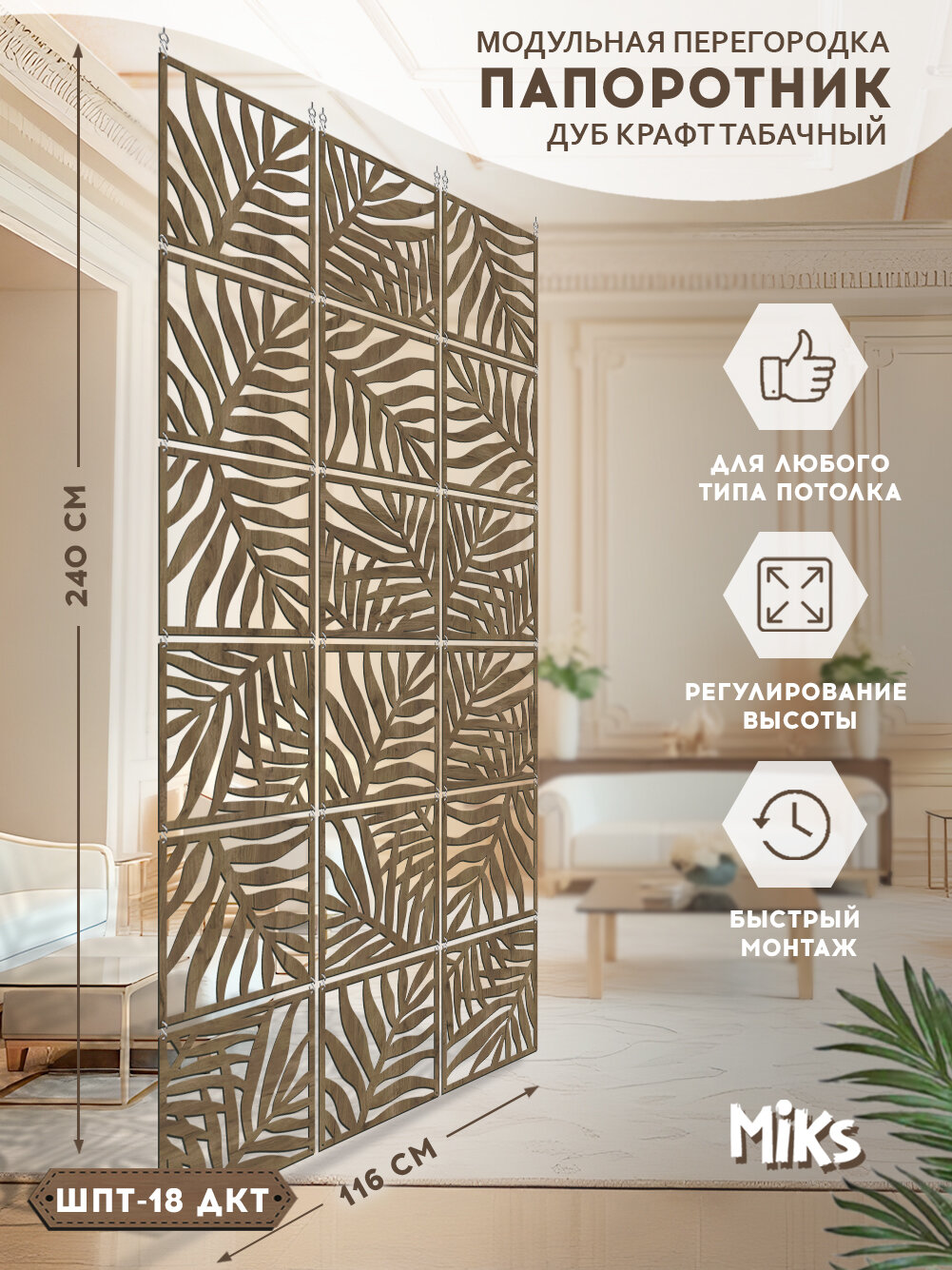 Ширма подвесная – модульная перегородка для зонирования помещения от Российской фабрики MiKs. Хотите стильный современный и уникальный интерьер в своей квартире, доме, ресторане или офисе? Не знаете, как зонировать пространство в своей гостиной, спальне, кухне, в кабинете или детской комнате, чтобы это было красиво, функционально и недорого? Компания Микс знает решение. Декоративный элемент мебели для визуального зонирования пространства – подвесная ширма. Это декоративная перегородка, сделанная из высококачественных материалов, имитирующих дерево разных пород. Ширма для зонирования пространства имеет отменные эстетические качества, благодаря чему служит настоящим украшением интерьера, подчеркивая стиль и элегантность оформления. Подвесная ширма для зонирования пространства от компании Микс выглядит стильно, красиво и современно и подойдет в любой интерьер. Ширма состоит из 18 штук панелей, размером 38*38 см с универсальными креплениями, что позволяет создать свою индивидуальность рисунка ширмы. Проявите свою фантазию и создайте уникальный индивидуальный дизайн своей ширме! Если четко следовать по инструкции, то перегородка очень легко и быстро собирается. В комплект уже входит качественный основной крепёж для монтажа перегородки к деревянному или бетонному потолку. Вы также можете приобрести в нашем магазине дополнительный крепёж для монтажа к подвесному потолку без закладной, армстронгу или к гипсокартону, а также приобрести цепи для увеличения длины ширмы для зонирования комнаты. Если требуются дополнительные панели, то их можно отдельно докупить. Минимальное количество 6 шт. Красивые и качественные декоративные ширмы от Микс впишутся в любой интерьер дома, квартиры, дачи. Интерьерные перегородки - ширмы будут стильно смотреться в ресторане, салоне красоты, в медицинских учреждениях, в офисе, в детском саду и других пространствах. Она поможет разделить и улучшить функциональность вашего пространства и создать более комфортную обстановку Так как перегородка пропускает часть света, то можно создавать интересные эффекты с тенями и освещениями. Разделение пространства: модульная перегородка - ширма может помочь разделить ваше помещение на разные зоны, что поможет создать более функциональное и удобное пространство. Например, вы можете использовать перегородку - ширму, чтобы разделить гостиную и зону для работы.