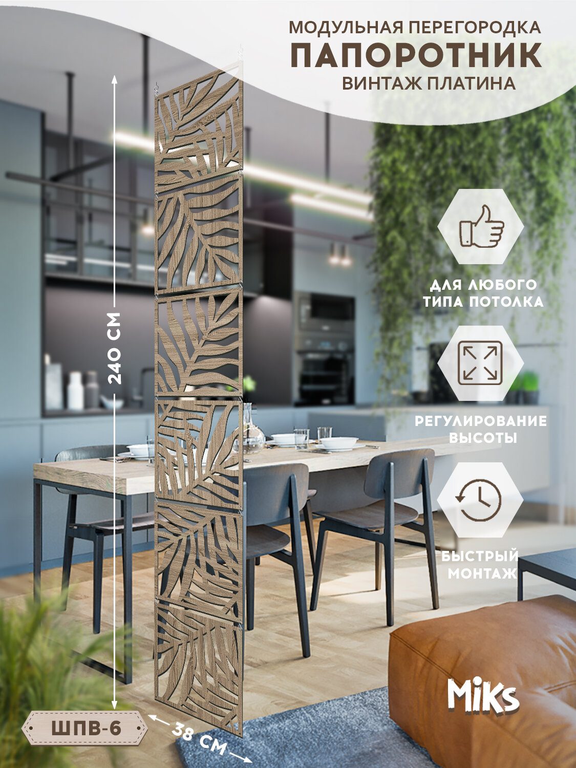 Ширма подвесная – модульная перегородка для зонирования помещения от Российской фабрики MiKs. Хотите стильный современный и уникальный интерьер в своей квартире, доме, ресторане или офисе? Не знаете, как зонировать пространство в своей гостиной, спальне, кухне, в кабинете или детской комнате, чтобы это было красиво, функционально и недорого? Компания Микс знает решение. Декоративный элемент мебели для визуального зонирования пространства – подвесная ширма. Это декоративная перегородка, сделанная из высококачественных материалов, имитирующих дерево разных пород. Ширма для зонирования пространства имеет отменные эстетические качества, благодаря чему служит настоящим украшением интерьера, подчеркивая стиль и элегантность оформления. Подвесная ширма для зонирования пространства от компании Микс выглядит стильно, красиво и современно и подойдет в любой интерьер. Ширма состоит из 24 штук панелей, размером 38*38 см с универсальными креплениями, что позволяет создать свою индивидуальность рисунка ширмы. Проявите свою фантазию и создайте уникальный индивидуальный дизайн своей ширме! Если четко следовать по инструкции, то перегородка очень легко и быстро собирается. В комплект уже входит качественный основной крепёж для монтажа перегородки к деревянному или бетонному потолку. Вы также можете приобрести в нашем магазине дополнительный крепёж для монтажа к подвесному потолку без закладной, армстронгу или к гипсокартону, а также приобрести цепи для увеличения длины ширмы для зонирования комнаты. Если требуются дополнительные панели, то их можно отдельно докупить. Минимальное количество 6 шт. Красивые и качественные декоративные ширмы от Микс впишутся в любой интерьер дома, квартиры, дачи. Интерьерные перегородки - ширмы будут стильно смотреться в ресторане, салоне красоты, в медицинских учреждениях, в офисе, в детском саду и других пространствах. Она поможет разделить и улучшить функциональность вашего пространства и создать более комфортную обстановку Так как перегородка пропускает часть света, то можно создавать интересные эффекты с тенями и освещениями. Разделение пространства: модульная перегородка - ширма может помочь разделить ваше помещение на разные зоны, что поможет создать более функциональное и удобное пространство. Например, вы можете использовать перегородку - ширму, чтобы разделить гостиную и зону для работы .