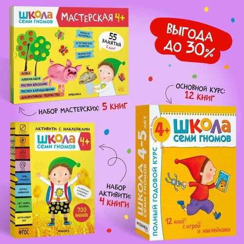 В большой комплект «Школа Семи Гномов 4+» входит всё необходимое для общего развития ребёнка от 4 до 5 лет, пополнения словарного запаса, тренировки памяти, умственной деятельности и мелкой моторики, а также раскрытия творческих способностей. Школа Семи Гномов – это система, а не набор книг. Она выстроена таким образом, чтобы ребёнок получил необходимые знания в правильный момент. Поэтому все книги в Школе Семи Гномов имеют четкую возрастную адресацию и разработаны строго с учетом возрастных возможностей ребенка. Но самое важное, чтобы занятия с ребенком давали результат и приносили радость. Поэтому все задания выстроены от простого к сложному и следуют принципу «развитие через игру». Заниматься с ребенком может любой взрослый, специальных знаний и опыта не требуется. Родительская страничка в каждой книге подскажет, что, как и почему нужно развивать в данном возрасте.