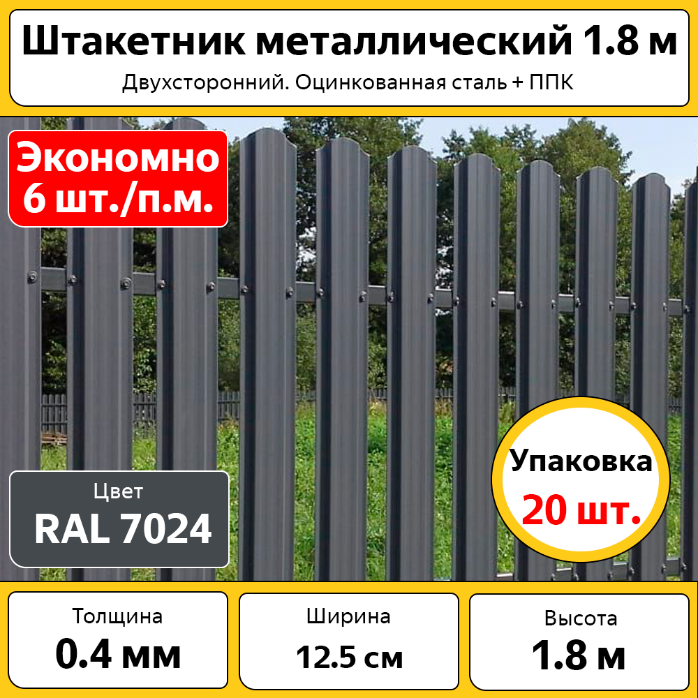 Штакетник металлический (евроштакетник) полукруглый (20 шт.) / высота 1.8 м / ширина 12,5 см / 0.4 мм / серый / оцинкованный: сравнение цен, характеристики, фото, актуальное наличие и цены.