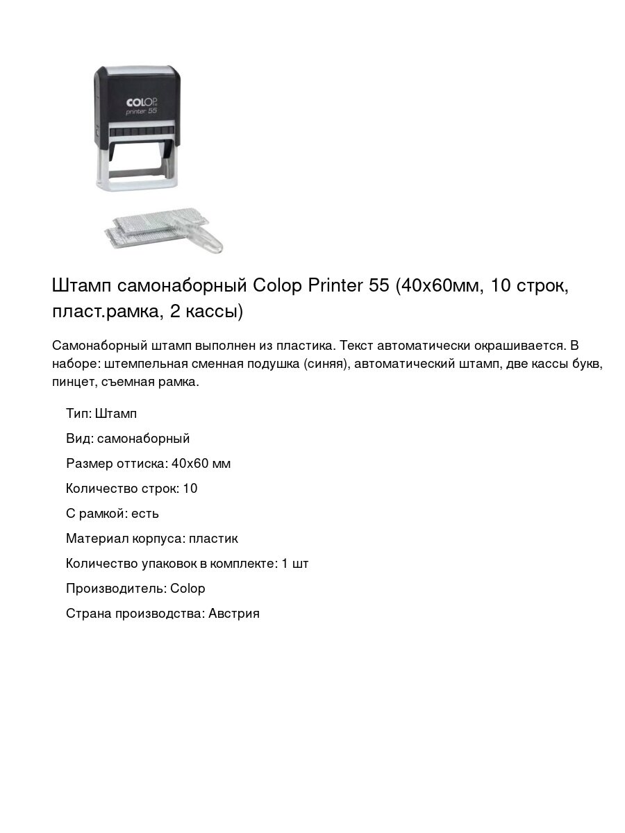 Штамп самонаборный Colop Printer 55 (40х60мм, 10 строк, пласт. рамка, 2 кассы): сравнение цен, характеристики, фото, актуальное наличие и цены.