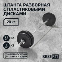 Штанга разборная BB-402, стальной гриф, пластиковые диски, 20 кг, BASEFIT Штанга разборная 20 кг - это разборный снаряд с пластиковыми дисками и стальным грифом для занятий по фитнесу и тяжелой атлетике бренда BASEFIT, общий вес штанги 20 кг. Данная штанга предназначена для бережного использования, не рекомендуется бросать на пол.