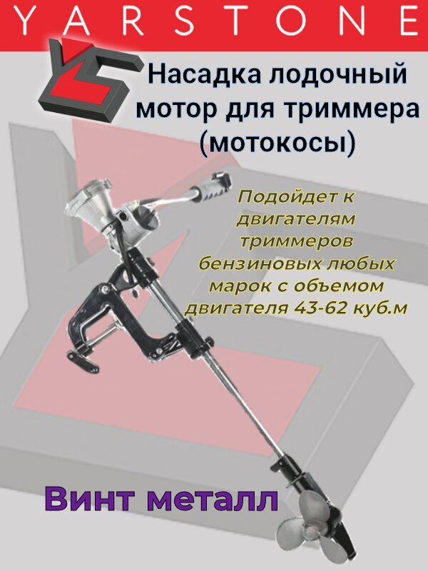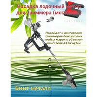 Насадка-редуктор (Бензотриммера) для превратить двигатель Любого бензинового триммера в лодочный мотор. Единственное условие - двигатель триммера должен иметь рабочий объем не менее 33 см3. Насадка поставляется с металлическим гребным винтом. Струбцинами (в комплекте) крепится к лодке.