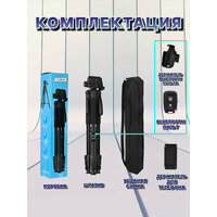 Особенности штатива включают в себя Bluetooth, пульт дистанционного управления, съемную головку, удлинительную штангу, уровень и чехол в комплекте. Это делает его многофункциональным и удобным в использовании.