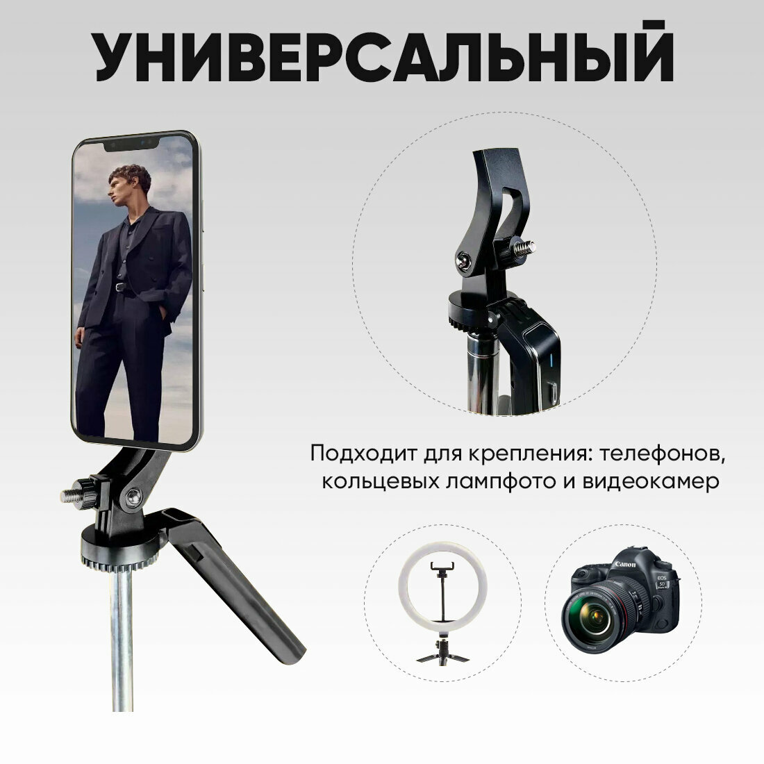 для видеокамеры, для кольцевых ламп, для телефона, для фото- и видеокамер, для фотокамер, универсальное, экшн-камера