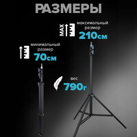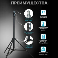 Данная стойка обладает стальной, усиленной конструкцией, которая гарантирует надежность во время съемок. Высота составляет 210 см, что позволяет создать идеальные ракурсы в любых условиях. Напольный дизайн делает использование легким в помещении и на улице.