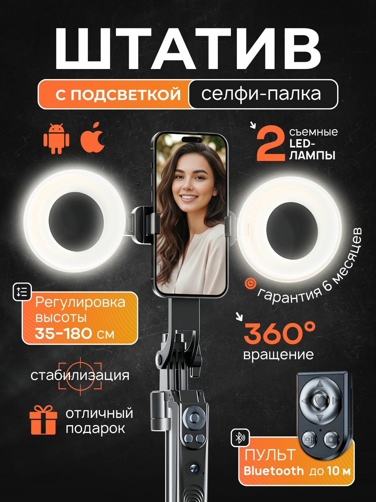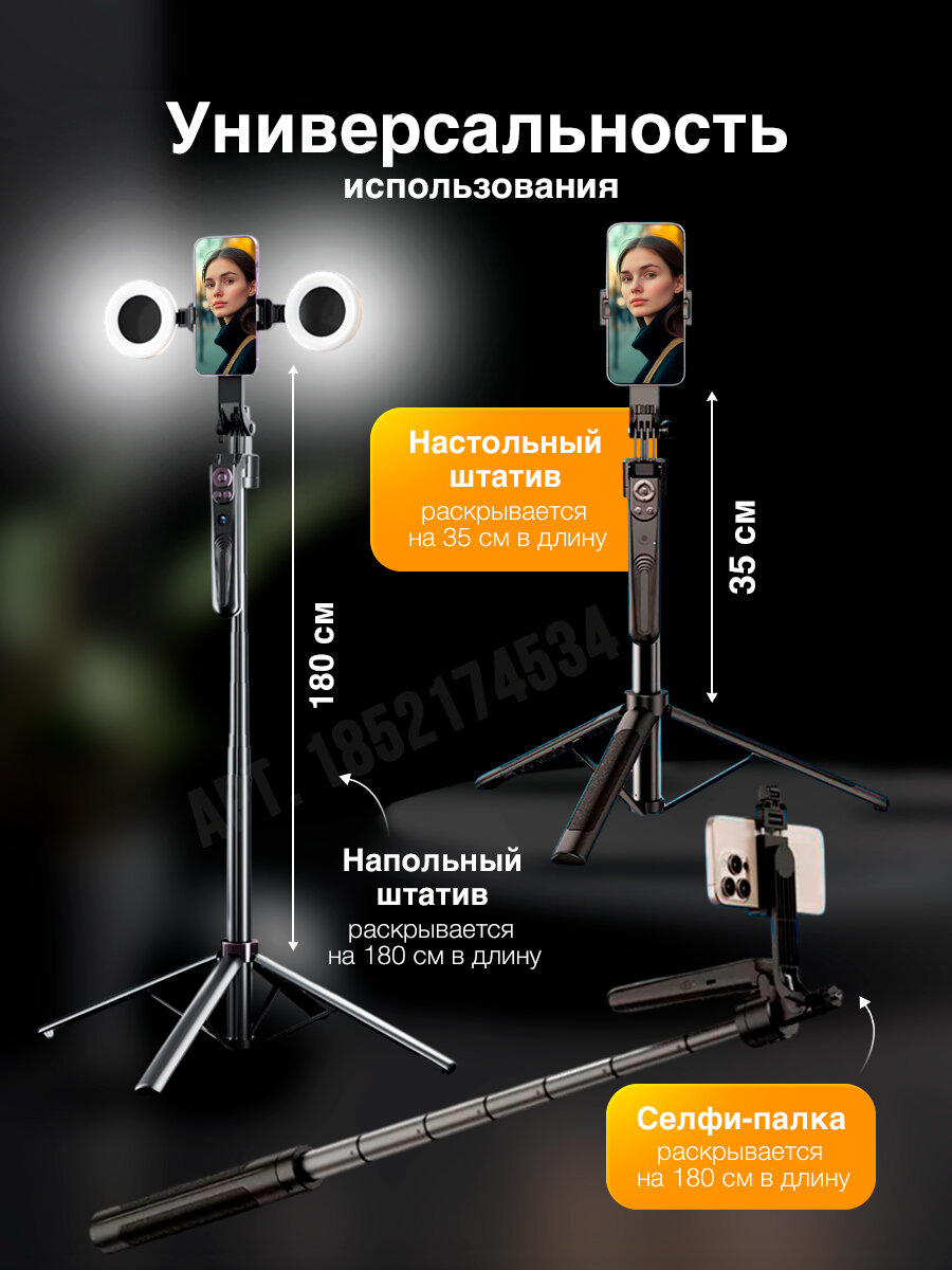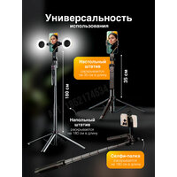 Представляем универсальный штатив для телефона с подсветкой в 3 режимах и высотой от 32 до 180 см — отличное решение для блогеров, преподавателей, спортсменов, фотографов и всех, кто ценит качественный контент. Штатив используется как селфи-палка или монопод.