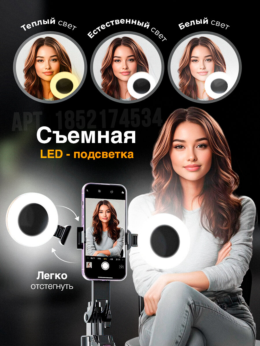 Создавайте профессиональные видео и фото с моноподом. Этот штатив универсальный для телефона заменит сразу несколько устройств: монопод для телефона с подсветкой, стойку для телефона для съемки напольную, селфи палку для телефона Samsung с подсветкой и штатив для света и телефона.