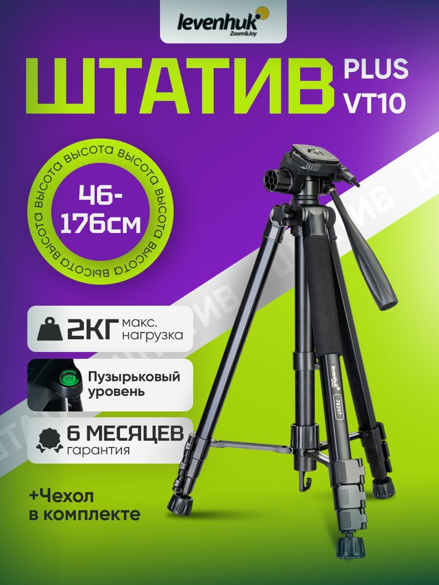 Напольный штатив Levenhuk Level PLUS VT10 интересен тем, что в любой момент может превратиться в монопод. Для этого нужно лишь полностью выдвинуть и снять центральную штангу – она и станет ручкой монопода. Благодаря этому штатив идеально подходит для путешествий - его можно использовать и стационарно, и с рук. Нагрузка на штатив не может превышать 2 кг, это нужно учитывать при выборе устанавливаемой техники. В комплектацию включен чехол для переноски и хранения. Штативная головка дополнена быстросъемной установочной площадкой, которую можно откидывать вбок на угол до 90°. По горизонтали штатив дает панорамный обзор, т. е. его головку можно поворачивать на 360°. Также ее можно отклонять вверх и вниз. На всех осях присутствуют фиксаторы. Стандартное крепление 1/4 дюйма позволяет закреплять на штативе практически любую современную технику, для фиксирования некоторых приборов может понадобиться адаптер-переходник (нет в комплекте).