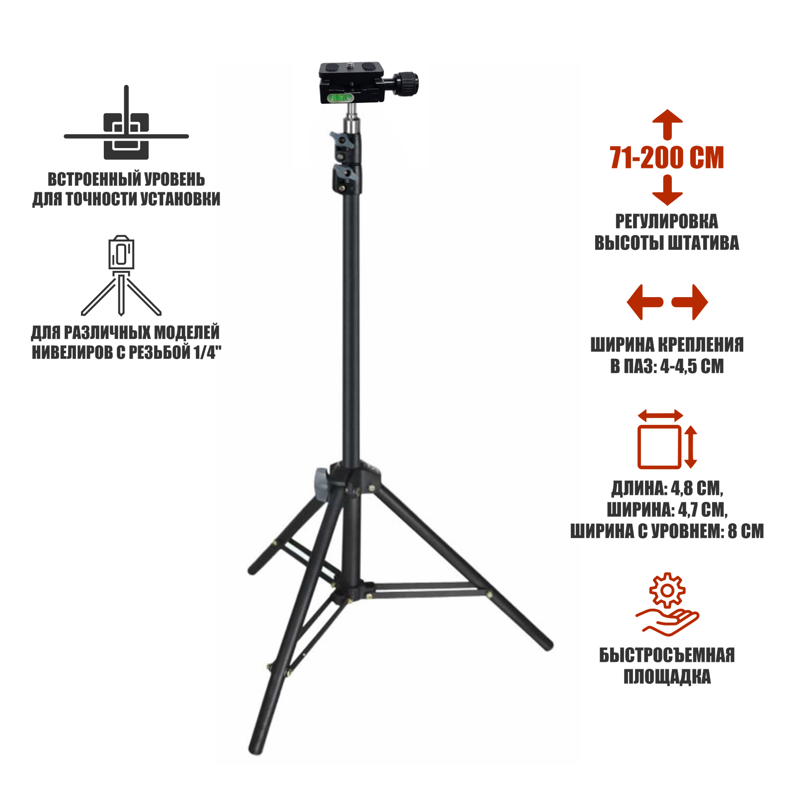 Штатив имеет регулировку высоты от 71 до 200 см, что делает его универсальным для различных видов работ и условий. Быстросъемная площадка с пузырьковым уровнемером на резьбе 1/4 дюйма позволяет легко и быстро установить и снять измерительное оборудование с таким же типом резьбы.