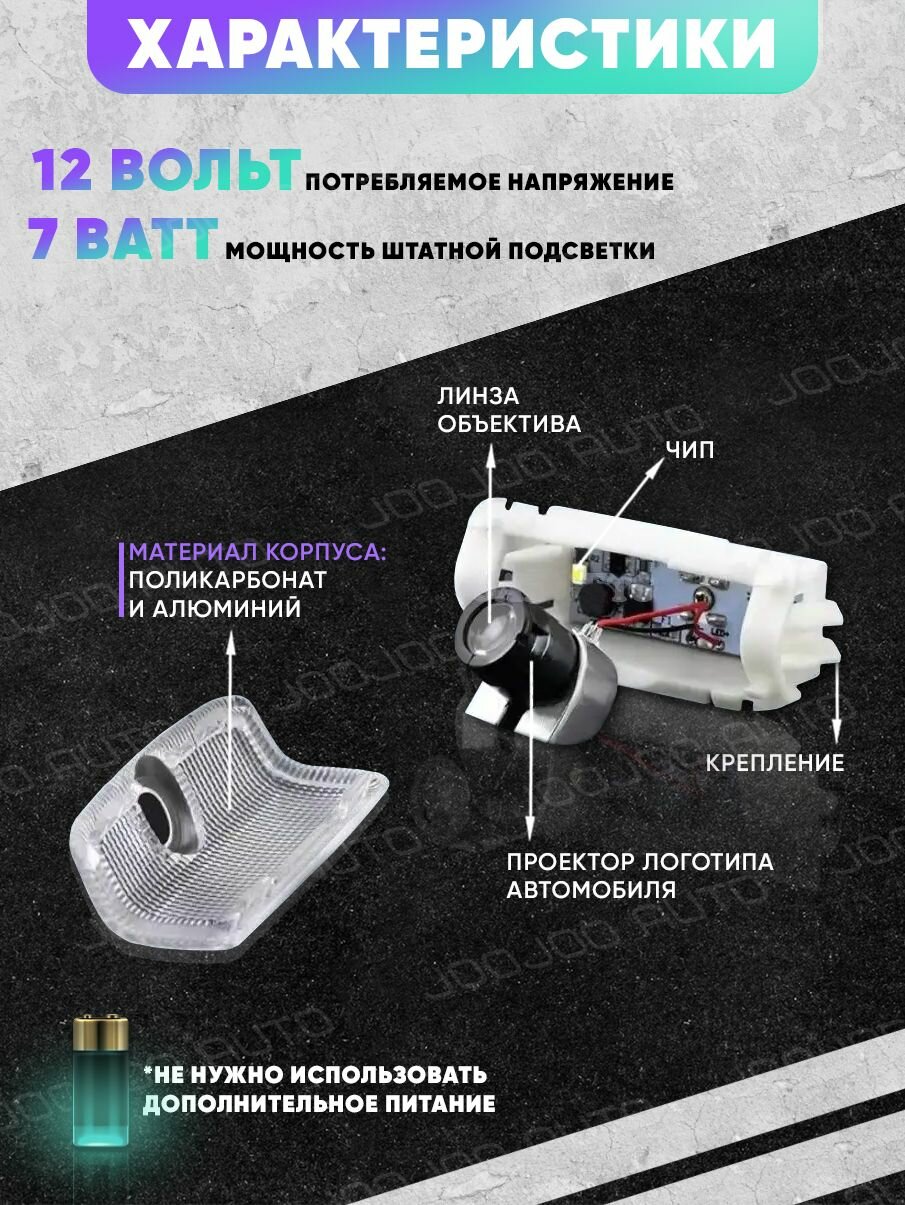 В комплекте две штатной подсветки логотипа, предназначенных для установки на двери автомобиля. Каждое устройство оснащено лазерной проекцией, которая создает силуэт логотипа автомобильного бренда на поверхности земли. Это позволяет сделать процесс входа и выхода из автомобиля более эффектным и стильным.