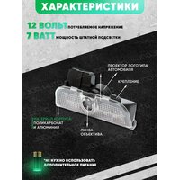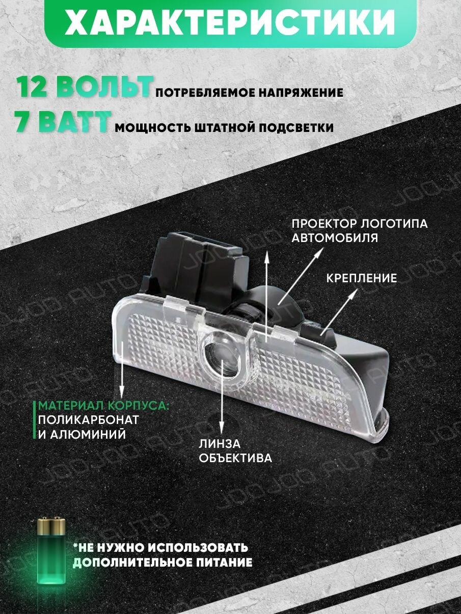 В комплекте две штатной подсветки логотипа, предназначенных для установки на двери автомобиля. Каждое устройство оснащено лазерной проекцией, которая создает силуэт логотипа автомобильного бренда на поверхности земли. Это позволяет сделать процесс входа и выхода из автомобиля более эффектным и стильным.