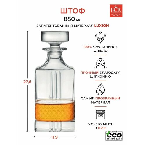 Штоф RCR Brillante 850 мл. RCR итальянская посуда это качественная стекольная промышленность. Материал хрустальное стекло без примесей свинца экологически чистое хрустальное стекло LUXION .RCR с его опытом предлагает широкий спектр решений для дома, с предложениями для каждого потребителя, и профессиональной сфере гостеприимства: бокалы, стаканы, тарелки и аксессуары для обедов и ужинов, приемов, встреч, мероприятий и вечеринок с несколькими решениями для праздничности. Главные качества бренда это прозрачность один из самых прозрачных материалов , блеск свойство чистейшего сырья ,прочность благодаря цирконию и наличию полудрагоценных материалов в составе , посудомоечная машина до 4000 помывок , звучность колокольный звон , 100 %перерабатывающий материал.Материал ЭКО хрусталь.11,9*11,9*27,6 см.