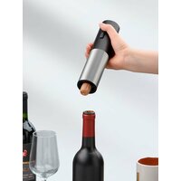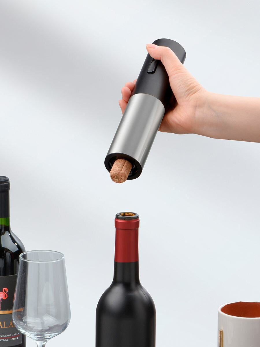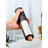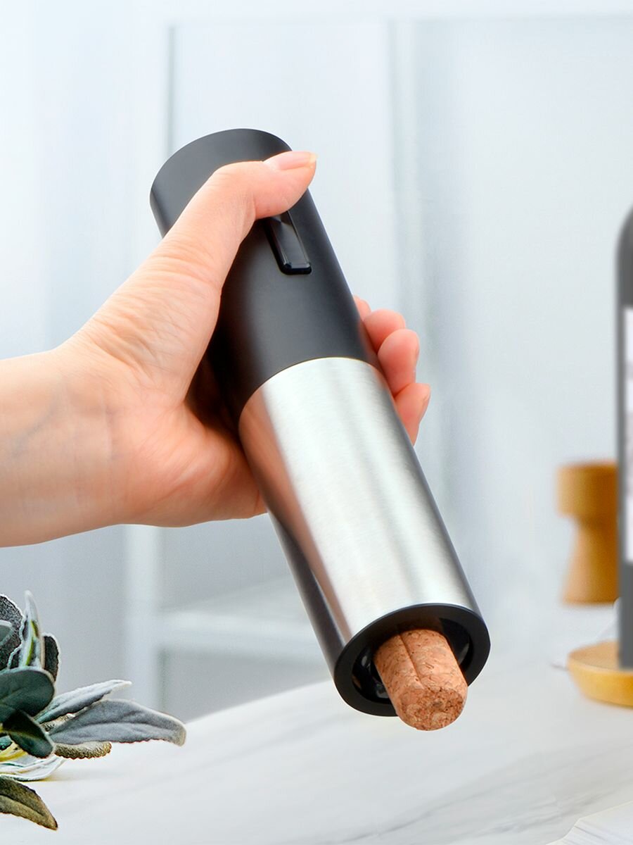 Стильный девайс для ценителей благородных напитков - барный набор с электрическим штопором и оригинальными аксессуарами для открывания и хранения бутылок с алкогольными напитками. Утонченный дизайн, портативный корпус и целевое назначение позволяют значительно облегчить удаление деревянной пробки. Механические и ручные железные открывашки часто не справляются с плотно закрытыми бутылками полусладкого, заставляя изрядно понервничать хозяина. Порадуйте гостей и близких, брата или сестру, деда или бабушку, любимую маму или отца, руководителя или сотрудника с работы красным или белым напитком на вашем столе. Барменский премиальный комплект включает в себя спиральный автоматический электроштопор, вакумную пневмат пробку, пищевой мини нож для фольги и красивый аэратор. Умный электроштопор тубус подходит под любой диаметр горлышка на бутыль. Наведите спиральный элемент на пробковую крышку, нажмите на кнопку и наслаждайтесь простым и быстрым процессом раскупорки напитка. Острые резцы спирали мгновенно погружаются в пробку из дерева любой плотности, мастерски вытягивая ее из тесного горлышка. Металлическая спираль из нержавейки не боится влаги и выполнена из качественного сплава, которому характерен продолжительный срок эксплуатации. Необычный домашний набор для бара и виноделия дополняет нож для удаления фольги. Он добавит процессу приготовления некоторой роскоши и романтичности. Стильный аэратор - это деталь, которая позволяет насытить напиток необходимым кислородом, каскрывая вкус вина. Кроме этого, в комплекте идет вакуумная пневматическая пробка для хранения содержимого бутылки в холодильнике или шкафу. Универсальная форма подойдет для горлышка разного размера. Стильные принадлежности бармена - это прекрасное дополнение к вашей привычной посуде в дом.