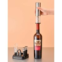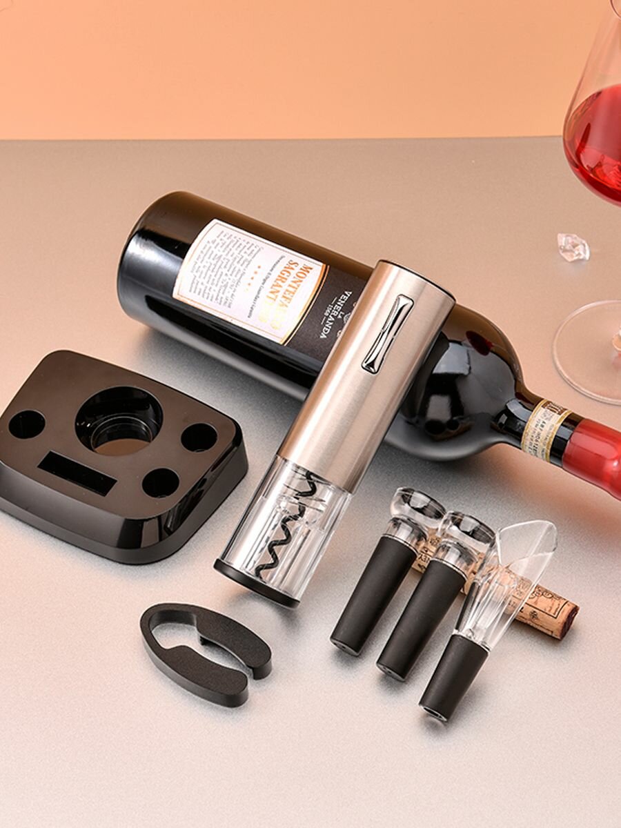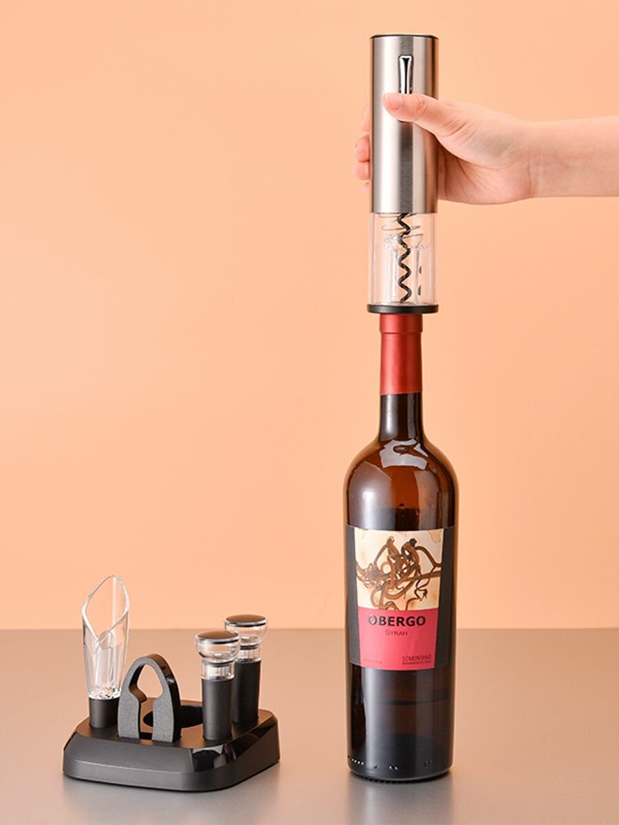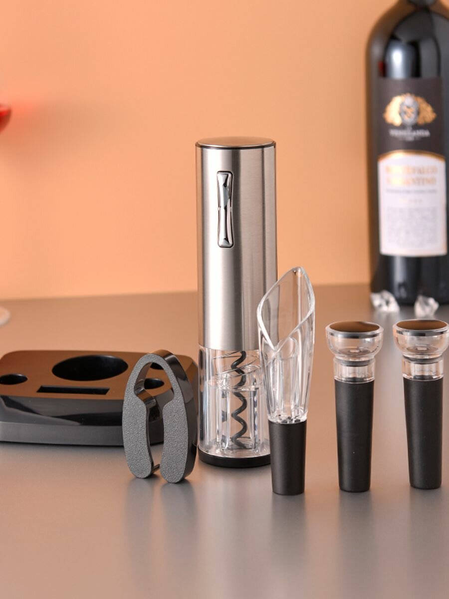 Данный набор пригодится к любому застолью. С его помощью можно легко и без усилий открыть бутылку с любимым вином, штопор справится с любой пробкой — натуральной или пластиковой. Штопор работает от нажатия кнопки. В отличие от обычного ручного штопора, он аккуратно захватывает пробку, не ломая и не кроша ее. Больше никаких неаппетитных крошек в бокале. Извлечение целой пробки происходит также при помощи кнопки — просто и удобно. Благодаря этому процесс происходит максимально безопасно и быстро. Комплект для вина 6-в-1 представляет собой сразу 6 стильных аксессуаров: Сам штопор с электрическим мотором, который позволяет извлечь пробку в считанные секунды. Нож для фольги поможет аккуратно и безопасно срезать металлизированную упаковку с горлышка любой бутылки. Удобный аэратор позволит при наливании вытеснить резкие винные пары и насытить благородный напиток пузырьками воздуха для более легкого утонченного вкуса и раскрытия букета. Благодаря скошенному краю вино не проливается и не разбрызгивается. С двумя вакуумными пробками можно закупорить начатую бутылку вина, так напиток не выдохнется и сохранит свой вкус и аромат до 7 дней, насос поможет избавиться от пузырьков воздуха, при повторном закупоривании бутылки. Подставка для набора поможет сохранить уют и комфорт на кухне. Штопор выполнен из прочного матового металла. Покрытие не скользит в руках, на нем не остаются отпечатки пальцев. Металлический стержень из нержавеющей стали прослужит долго, материал не окисляется, а значит, не испортит вкус напитка. Устройство работает от батареек. Штопор можно смело поставить в один ряд с такими брендами, как Xiaomi, Circle joy, Houhuo, а цена вас приятно удивит.