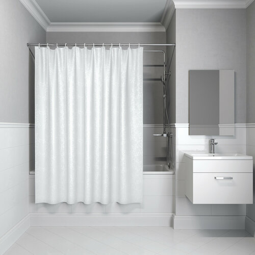Текстильная штора для ванной белого цвета с ненавязчивым узором гармонично впишется в классический и современный интерьер.