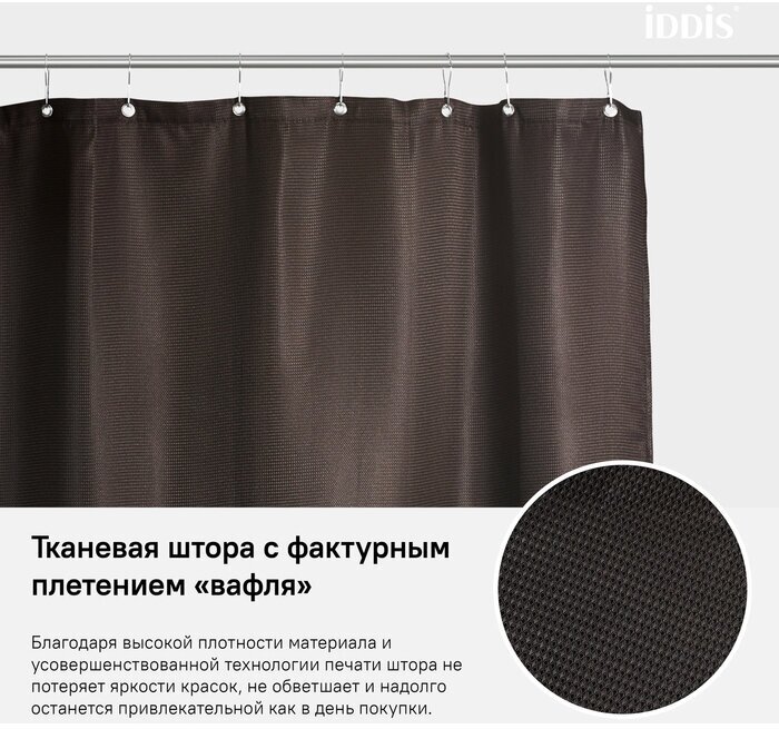 Текстильная штора из линейки Decor темно-шоколадного оттенка поддерживает современный тренд на натуральность в интерьере. Модель изготовлена из 100% износостойкого полиэстера с водоотталкивающей пропиткой – при попадании на ткань вода не впитывается, а скатывается с нее каплями. Тканевая штора с фактурным рисунком «вафля» смотрится невероятно свежо и актуально. ● Прочные хромированные люверсы (12 шт.) эффектно завершают облик изделия. С течением времени они не деформируются, не будут ржаветь сами или оставлять ржавых разводов на ткани. ● Уход за шторой для ванной IDDIS® прост и необременителен. Изделие можно стирать в стиральной машине как обычный домашний текстиль, оно не требует глажки – достаточно после стирки просто повесить его на карниз. ● Благодаря высокой плотности материала и усовершенствованной технологии печати штора IDDIS® не потеряет яркости красок, не обветшает и надолго останется привлекательной как в день покупки. ● Гарантия на текстильные аксессуары IDDIS® – 1 год.
