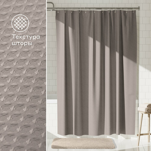 Бежевая штора из полиэстера повышенной плотности с водоотталкивающей пропиткой надёжно защищает помещение от брызг. Капли воды скатываются по поверхности, а материал устойчив к появлению грибка и плесени. Утяжелитель по нижнему краю удерживает штору расправленной, поэтому она не прилипает к телу во время принятия душа.