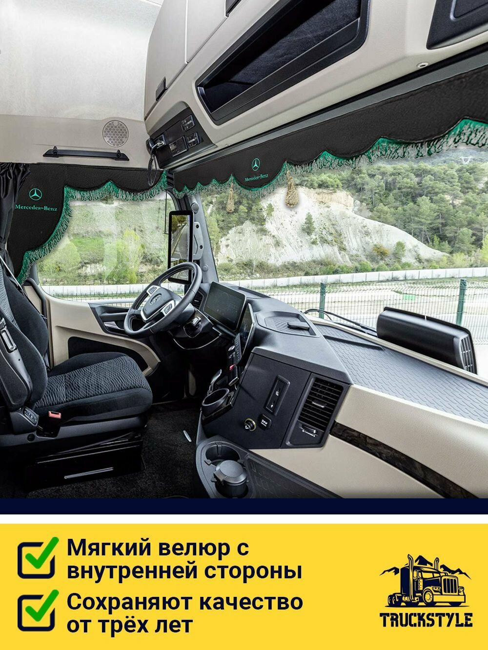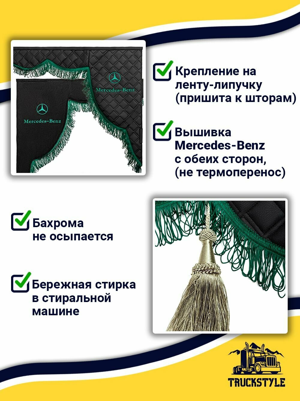 Шторка автомобильная MERCEDES для грузовиков. Комплект ламбрекен с косынками. Шторки солнцезащитные на лобовое и боковые двери. Черный цвет с зелеными кистями (лапша). Мерс: сравнение цен, характеристики, фото, актуальное наличие и цены.