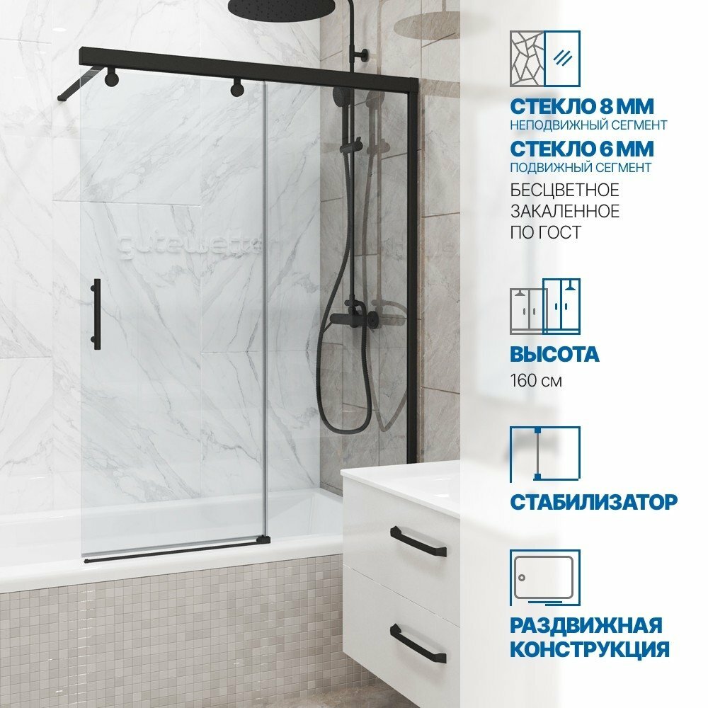 Характеристики - Длина, см — 120 - Высота, см — 160 - Цвет профиля и фурнитуры — черный матовый - Цвет стекла — бесцветный - Толщина стекла подвижного сегмента, мм — 6 - Толщина стекла неподвижного сегмента, мм — 8 - Конструкция дверей — раздвижная - Открывания двери — левое / правое - Ширина прохода, см — 55 - Регулировка профиля, мм — +-15 - Монтаж ограждения — на ванну / на плитку