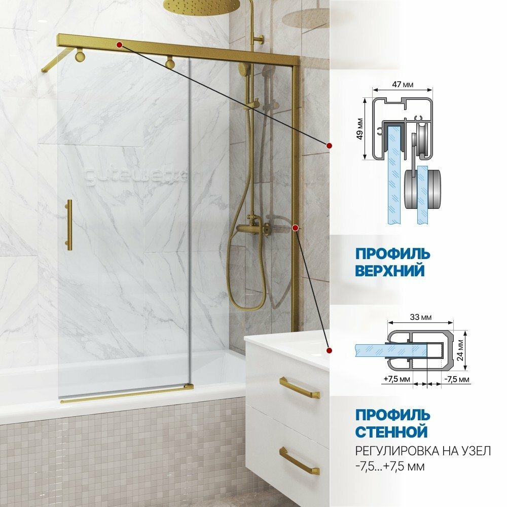 Шторка на ванну двухсегментная раздвижная GWMPSLPL862 производства фабрики GuteWetter. В шторке на ванну GWMPSLPL862 реализованы новейшие разработки профильных систем, позволившие отказаться от нижнего направляющего профиля. Теперь вход в душевое ограждение стал комфортнее. Поверхность пола в помещении без явных конструктивных дополнений переходит в пространство душа.