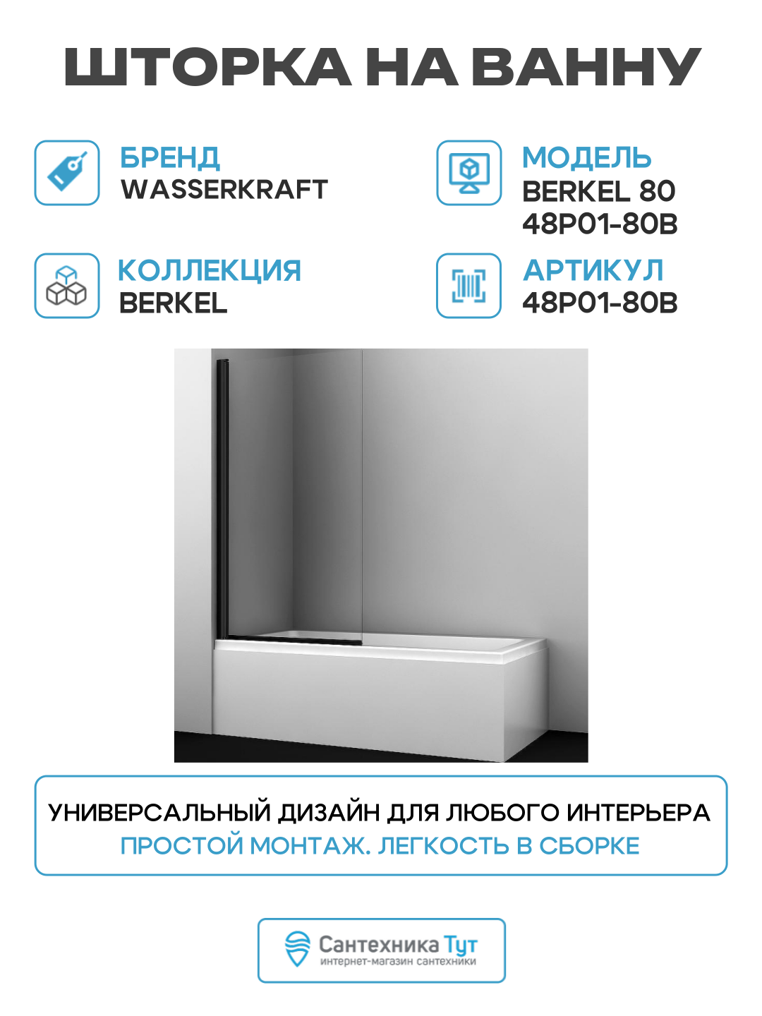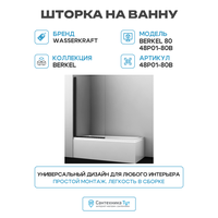 Купить Шторка на ванну WasserKRAFT Berkel 80 48P01-80B профиль Черный стекло прозрачное алюминий черный Германия с доставкой по всей России. Шторка на ванну WasserKRAFT Berkel 80 48P01-80B профиль Черный стекло прозрачное алюминий черный Германия: сравнение цен, характеристики, фото, актуальное наличие и цены.