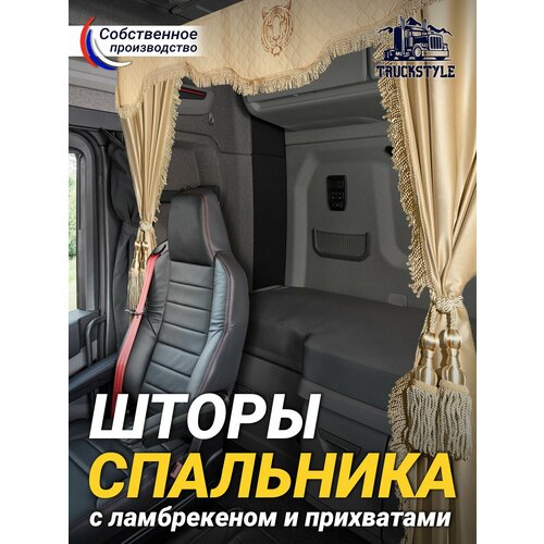 Купить Шторы спального места с ламбрекеном из экокожи с вышивкой Тигр и прихватами «Кисти» 150х115 см в кабину грузовика. Блэкаут, велюр. Бежевый цвет с бежевыми кистями-прихватами с доставкой по всей России.