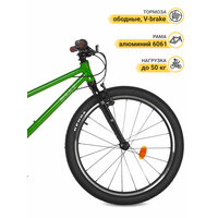 Высота сиденья регулируется под рост ребенка, а ручки ободных тормозов V-brake — под детские пальцы. В комплект входят катафоты и звонок, а на раму нанесены светоотражающие надписи, чтобы юные велосипедисты были еще заметнее на дороге.