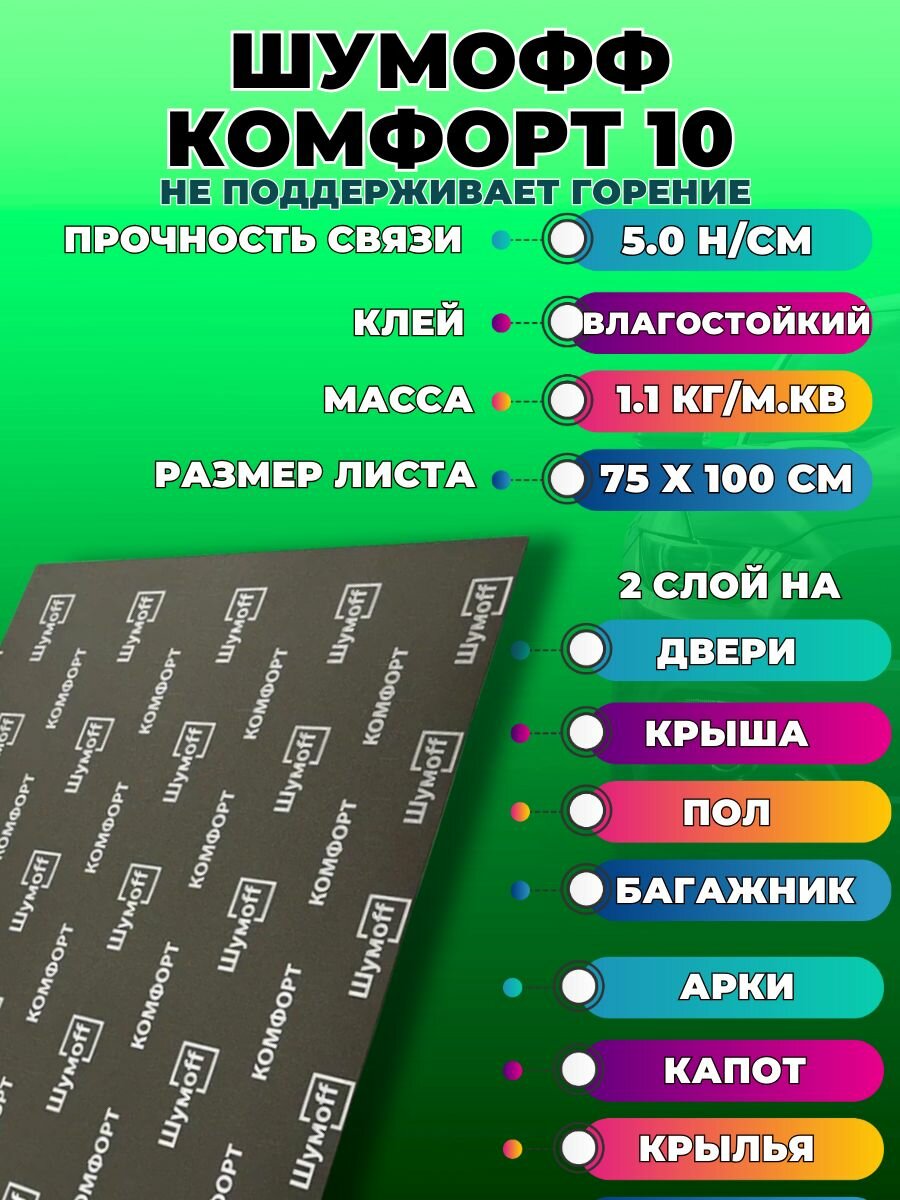Шумофф Комфорт 10 является тепло-звукоизоляционным материалом на основе вспененной резины черного цвета с водостойким клеевым слоем. Шумоизоляция Комфорт, толщиной 10мм низко горючий и не впитывает воду. Монтажный слой теплоизоляции защищен антиадгезионной бумагой с фирменным логотипом и линовкой. Идеально подходит для обработки поверхностей, имеющих выступы, изгибы и углубления.