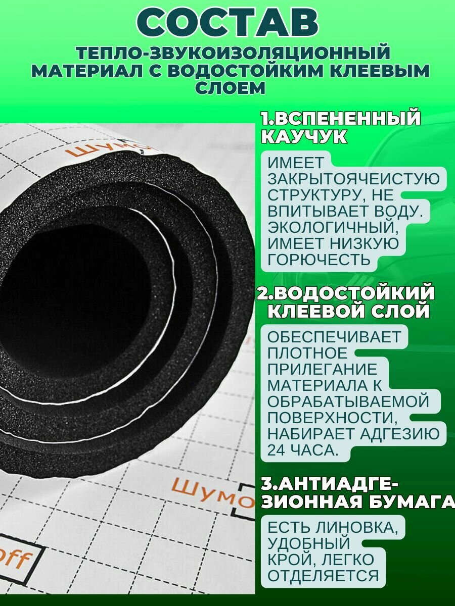 Шумoff Комфорт 10 разработан для шумоизоляции автомобиля, так же сочетает в себе свойства теплоизоляции и может применяться как утеплитель для автомобиля ( теплоизоляция для автомобиля ). Самоклеющийся вспененный каучук не впитывает воду, так как имеет закрытоячеистую структуру и влагостойкий клей. Применяется в быту для снижения шума труб канализации, стиральных и посудомоечных машин, а так же входных дверей. Может использоваться в качестве демпфера для снижения вибраций бытовой техники.