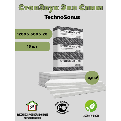 СтопЗвук Эко Слим 15шт (1,2м х 0,6м х 20мм) 10,8 м² Техносонус - тонкие шумопоглощающие плиты толщиной 20 мм из синтетического волокна. СтопЗвук Эко Слим techno sonus состоит из полиэфирных волокон, скрепленных между собой с помощью горячего воздуха и производится без использования фенолформальдегидных связующих. Не выделяет колючей пыли, вызывающей зуд, не гниет и не подвергается распространению грибка. По акустическим показателям и теплопроводности материал не уступает аналогам на основе минеральных волокон. Экологичная плита применяется при возведении стен, фасадов, кровли и межэтажных перекрытий и в стандартных звукоизоляционных системах - перегородках, обшивках и подвесных потолках, в качестве эффективного и безопасного шумопоглощающего материала. Производится из экологически чистого сырья. Соответствует европейским стандартам. Имеет высокие звукопоглощающие свойства. Низкая теплопроводность. Негорючий материал (не плавится, выдерживая температуру выше 1000°С). Не впитывает влагу и не подвержен гниению, воздействию грибка и насекомых. Легко режется и после установки не дает усадки. Высокая жесткость, устойчивость к деформациям. Сохраняет свои качества в течении срока эксплуатации. Применение: Материал СтопЗвук Эко Слим монтируется так же, как и любая минеральная вата. Материал режется ножом и закрепляется пластиковыми грибками. СтопЗвук Эко TechnoSonus не даёт просадку и заполняет все свободные полости. При монтаже материал не требует средств индивидуальной защиты (перчатки, маска, респиратор), не распадается на мелкие частицы, легко демонтируется в случае необходимости. Назначение: Подвесные и натяжные потолки, стены, перегородки, полы на деревянных лагах, кровля. Этот утеплитель из минеральной ваты предназначен для шумоизоляции помещений, в том числе квартир. Мин вату утеплитель можно использовать для утепления стен благодаря своей шумопоглощающей способности. Материал позволяет обеспечить эффективную звукоизоляцию и звукопоглощение.