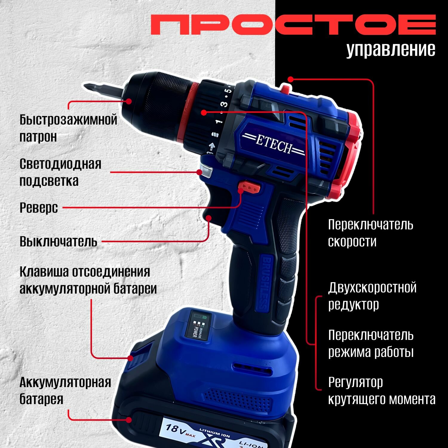 Шуруповерт аккумуляторный бесщеточный ETECH TEH-18BL, 18В, 2 аккумулятора 2А/ч, 60Нм, металлический патрон + набор насадок: сравнение цен, характеристики, фото, актуальное наличие и цены.