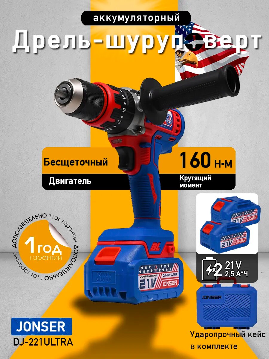 Купить Шуруповерт Jonser N_DJ-221 ULTRA, 21В, 160Нм, бесщеточный, быстрозажимной патрон с доставкой по всей России.