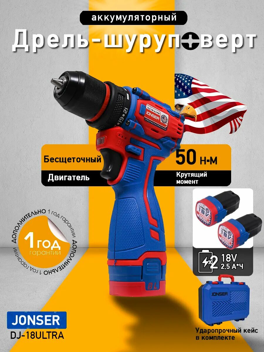 Шуруповерт Jonser N_DJ-18 Ultra, бесщеточный, 18В, 50Нм, 2 аккумулятора, кейс: сравнение цен, характеристики, фото, актуальное наличие и цены.