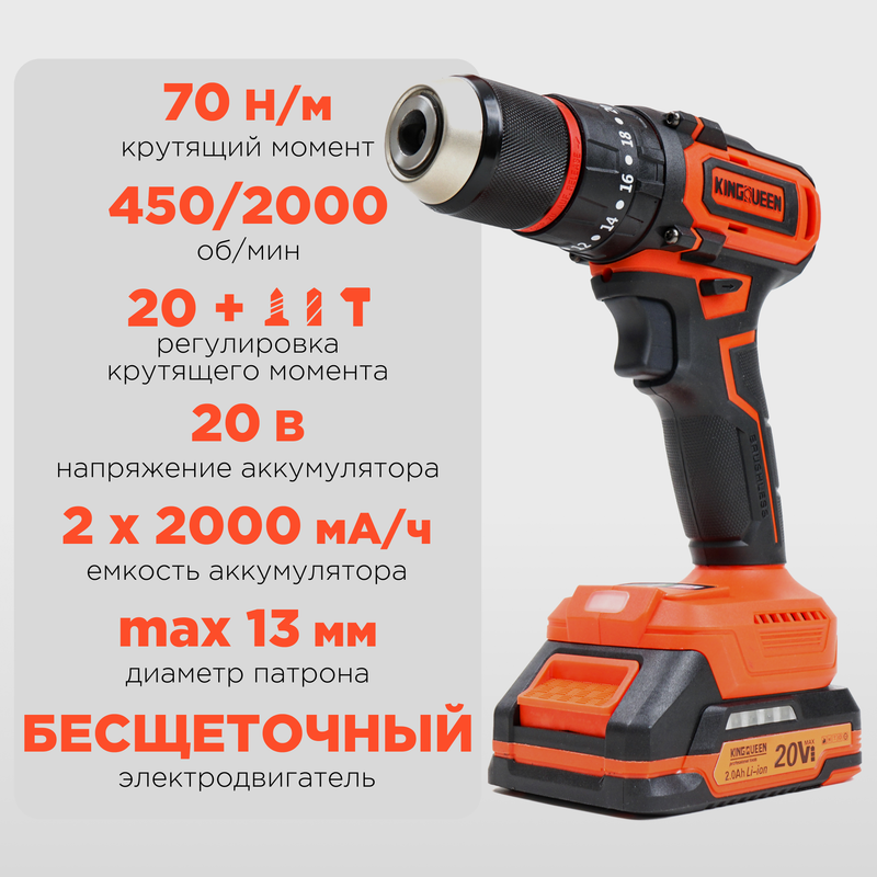 Купить Шуруповерт KINGQUEEN 20В, 70 Н/м, бесщеточный, ударный, патрон 13мм KQ-8021-13 с доставкой по всей России.
