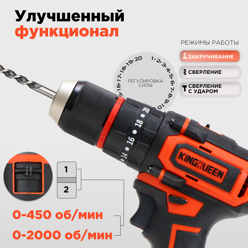 Шуруповерт KINGQUEEN 20В, 70 Н/м, бесщеточный, ударный, патрон 13мм KQ-8021-13: сравнение цен, характеристики, фото, актуальное наличие и цены.