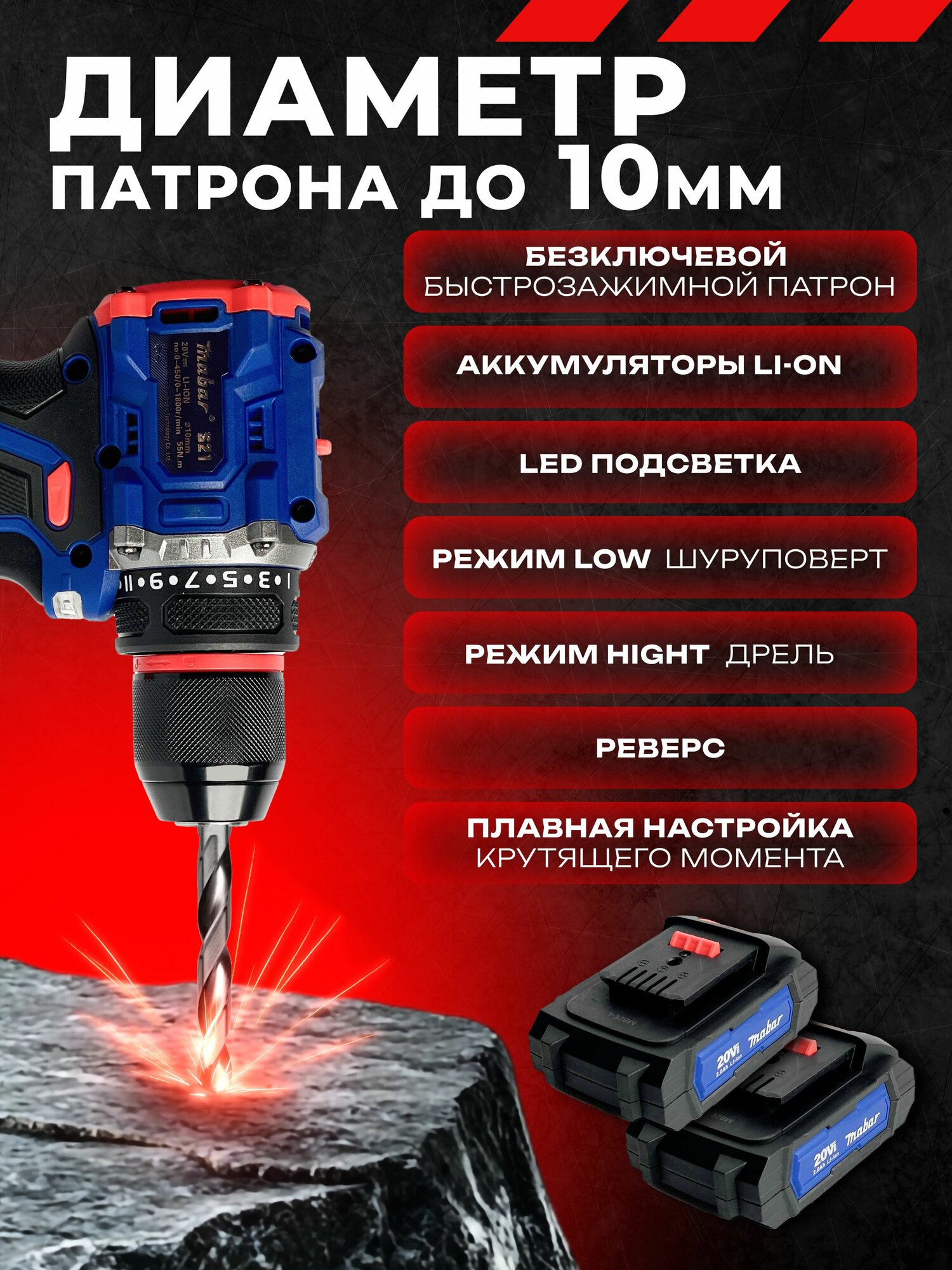 Дрель-Шуруповерт Mabar, профессиональная, 20В, 55Нм, 2 аккум, Li-Ion