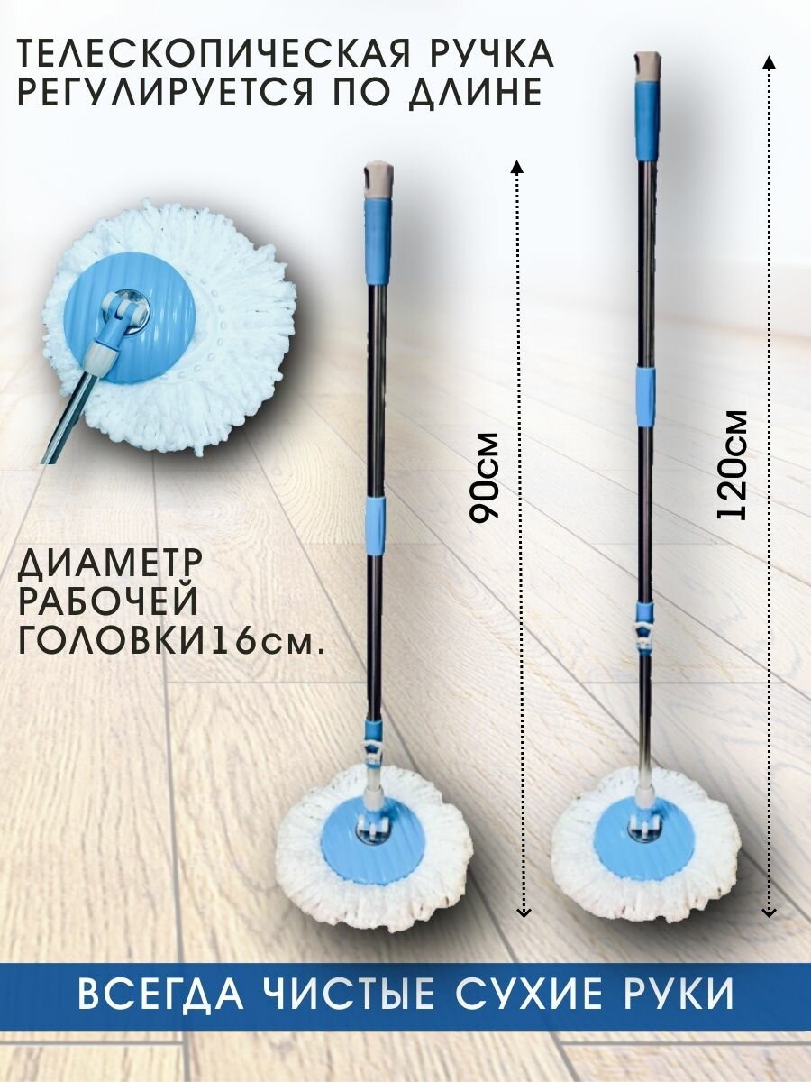 Швабра вертушка отлично справится с любыми поверхностями, а благодаря высокой впитываемости швабра с двумя насадками без ведра оставляет пол идеально чистым и без разводов.